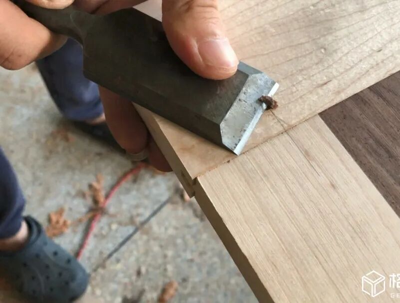 首先是画线,画出榫眼的位置,并用凿子凿出榫眼。