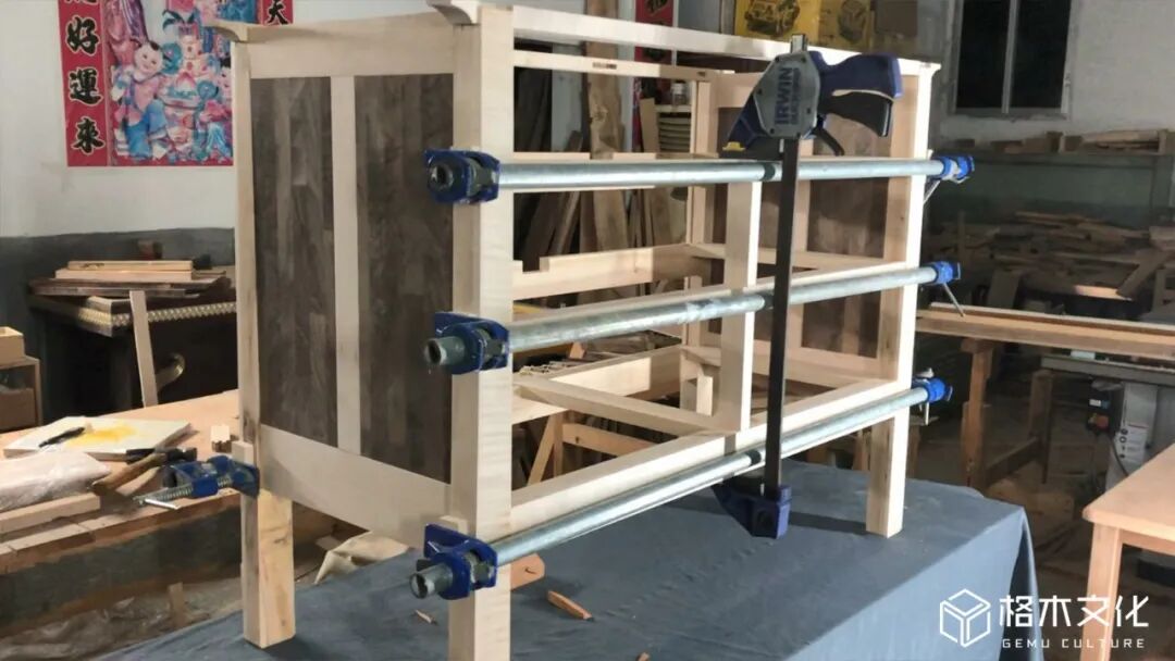 首先,在桌腿和其他工件的榫眼处涂上白乳胶,将柜子内部框架组装好,再与另一侧侧面板组装。