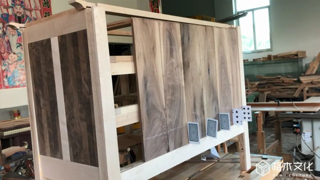几块较薄的黑胡桃木板组成柜子的背板,先将每块黑胡桃木板与底部相接,为了让每个背板之间的缝隙趋于一致,在左右相邻的两块木板中间放几张扑克牌,使作品更加美观。