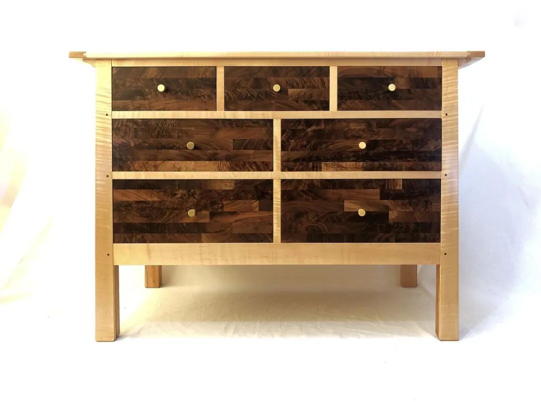 我们平日在制作家具的过程中,会产生大量的木材边角料,放在以前也就随手搁置,但这几年因为疫情的原因,相信大家都是能省则省。所以,为了不浪费资源,能够二次利用一些珍稀的黑胡桃边角料,我便设计制作了这台拼色桌柜。