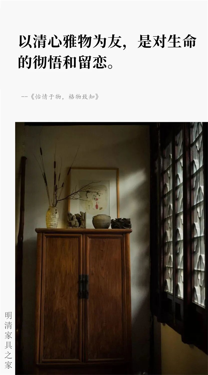 很多人沉迷于物的价值,却没有升华到精神层面。格物致知,关照物的品格于自身,写意无穷;怡情于物,吸收物的姿态于自我,流情无尽。