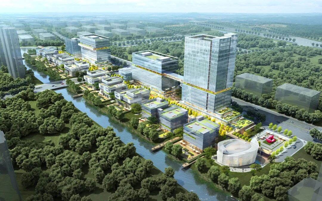 场地的一大亮点是一条贯穿园中的城市水系,设计充分利用景观资源优势,沿水岸布局庭院式办公与商业步行空间,打造滨水活力带。