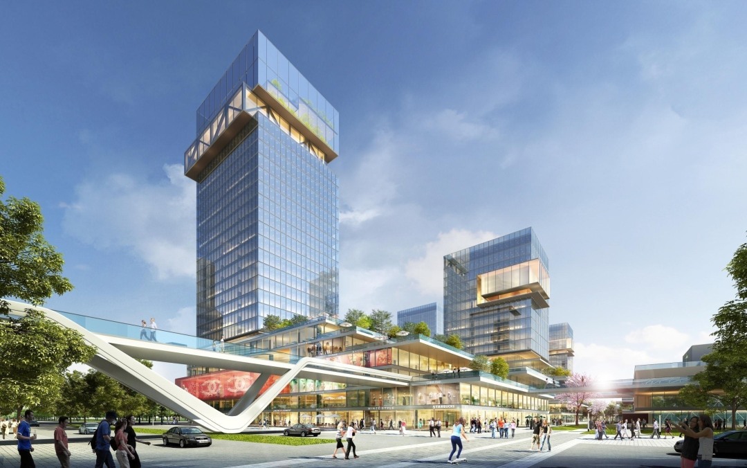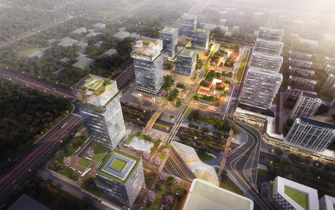 在石家庄宏泰国际生物医药产业园的设计中,FTA构建了全新的城市创新社区(Innovation District),在园区内创建一个吸引城市人气的中心交往空间,通过一条串联园区的带状景观交往空间,两个可以慢步的街道交往空间以及打破工作与生活界限的立体交往空间,打造开放、共享、生态的办公环境。