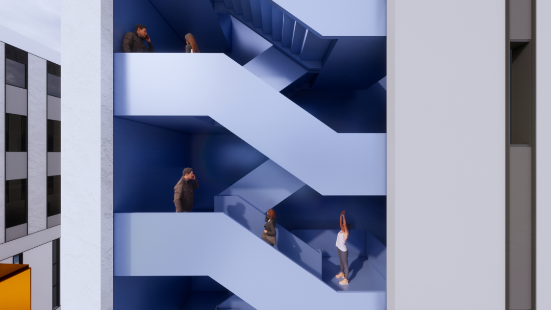 在建筑空间设计中,功能性楼梯往往被搁置在建筑的角落,成为看不见的“黑盒子”。FTA在建筑设计中,通过楼梯外置,打造活泼、鲜明的立面形象。以增加“四两拨千斤”的方式,通过增加1%的造价,为整体建筑的颜值与空间体验感带来150%的溢价。外置的楼梯间形成新的交往空间,可供人停留、交流与远眺,成为高容积率、高覆盖率的园区中的呼吸之所。