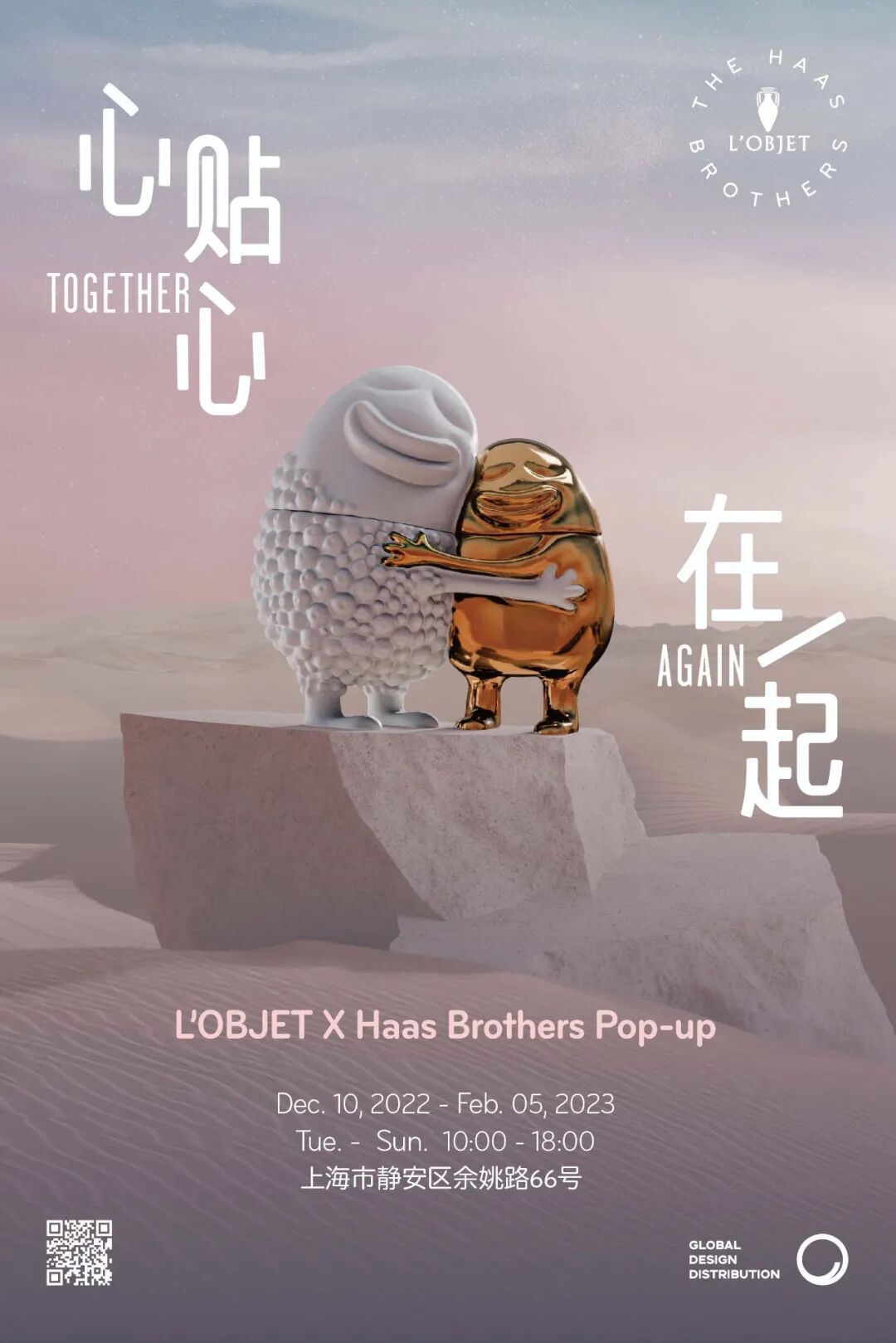 2022年12月10日至2023年2月5日,L’Objet × HaasBrothers:「心贴心,在一起 / TOGETHERAGAIN」Pop-up 将于 GalleryAll 上海空间呈现,全面展示艺术家居品牌 L'Objet 与洛杉矶艺术家组合 Haas Brothers 的两次梦幻合作,打造一个怪趣顽皮、个性十足的奇幻世界。