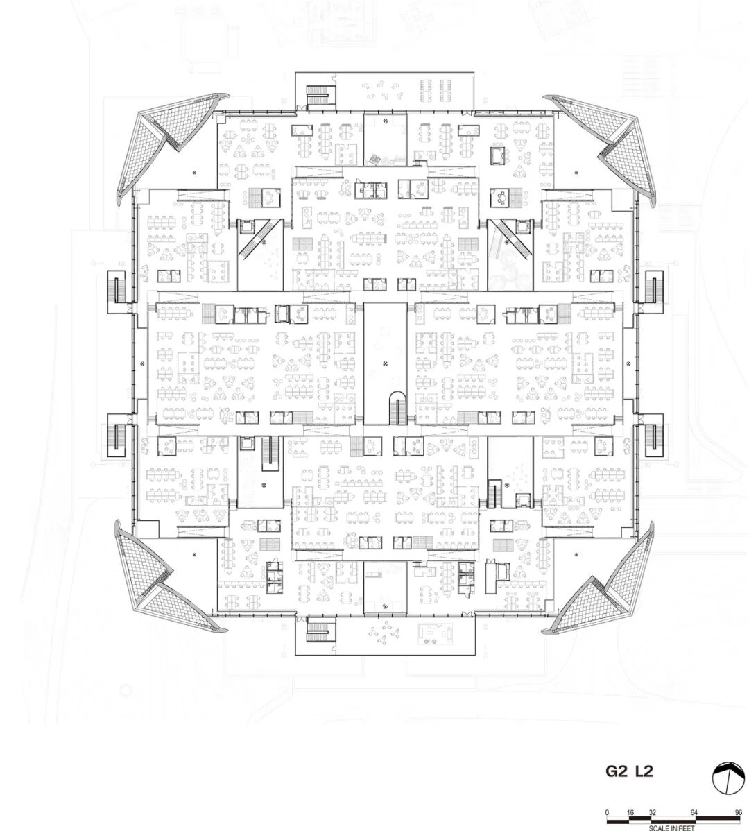 由钢管组成的网状结构和顶棚区块间的简洁天窗,以及不透明的屋面结构共同提供了最好的噪音控制,最小化太阳辐射热,降低了整体能源荷载,让Google可以通过外侧的PV阳光板获得最多的能量。顶棚还为内部的工作空间带来了没有眩光的自然光,使得建筑中的每个工位都拥有良好的室外视野,可以在一天中的大部分时间沐浴在日光之中。