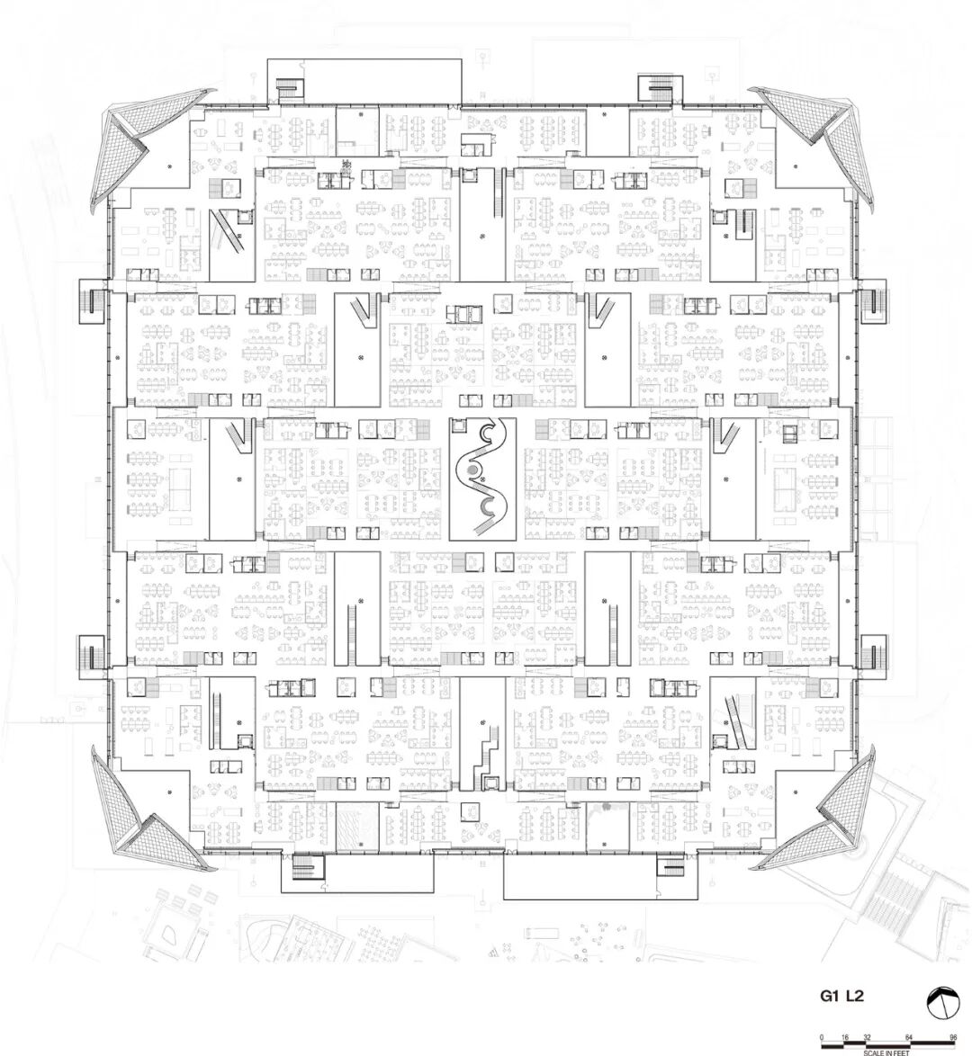 Bay View项目的建筑仅被分为两层,上层设置办公桌和团队空间,下层为休闲区。建筑中分布着一系列室内庭院,连通两个楼层,让团队成员可以方便地进入下方的咖啡厅、餐厅会议室等各种空间。庭院也是找路装置,让员工在不同楼层之间移动,转换工作模式,有益于他们的生理健康。