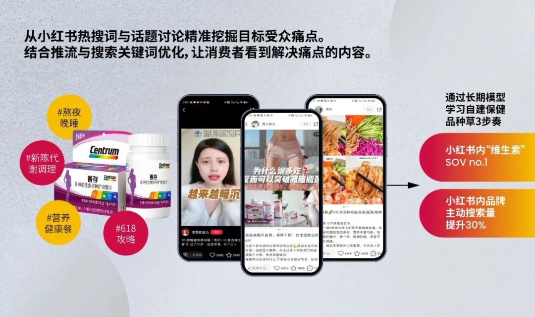 2、 种草式投放:瞄准提升小红书平台用户对产品的认知和兴趣,同时联动社交运营团队,从搜索场景的筛选和相关热搜关键词的挖掘中精准锁定目标用户,比如减脂、塑形、营养补充、加班、皮肤暗沉等等,运用笔记埋词和搜索广告拦截,结合原生和付费流量齐头并进,在运营层面不断沉淀优质笔记,投放2个月来CTR提升224%。