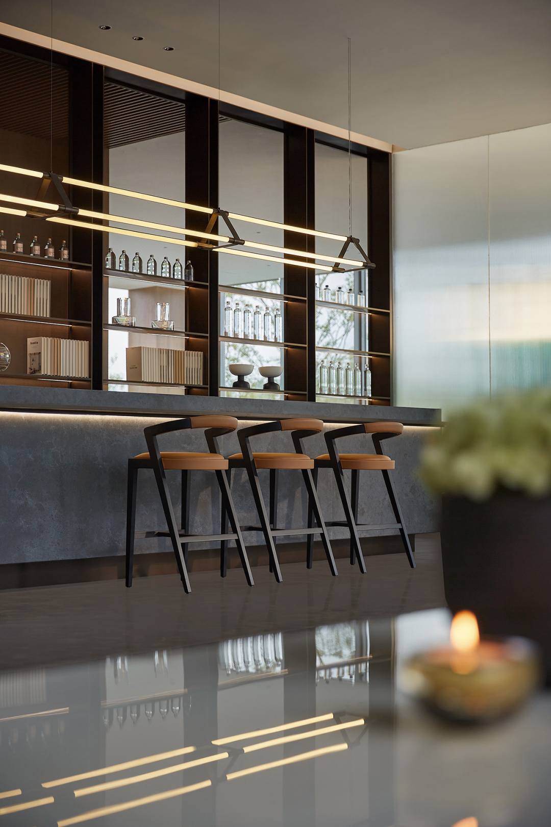 每一方寸都历经反复推敲,将水吧台顺理成章的隐于楼梯之下,旨在探寻其最优利用。借由体块错位穿插,让吧台与楼梯表达着整体构成,粗粝的石材与细腻的金属融会贯通,则是对材质、细节的延续以及因地因时制宜的演绎。