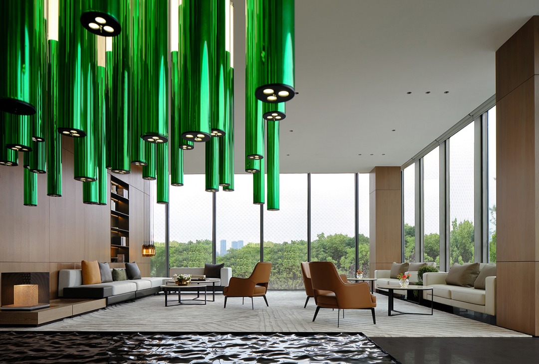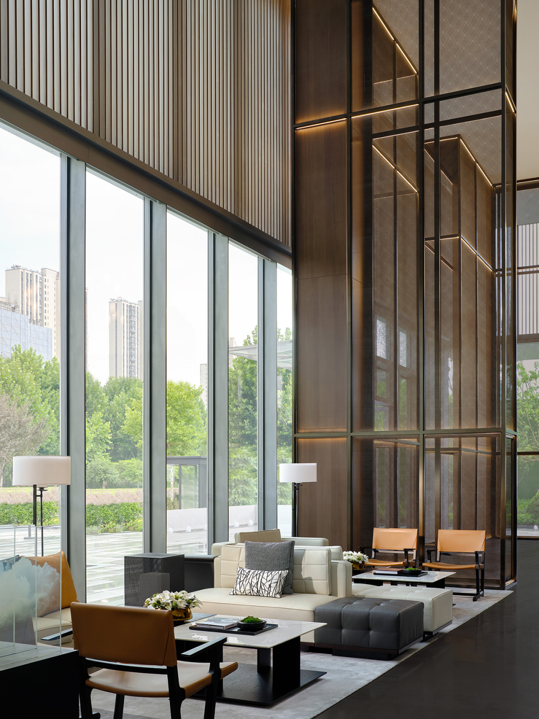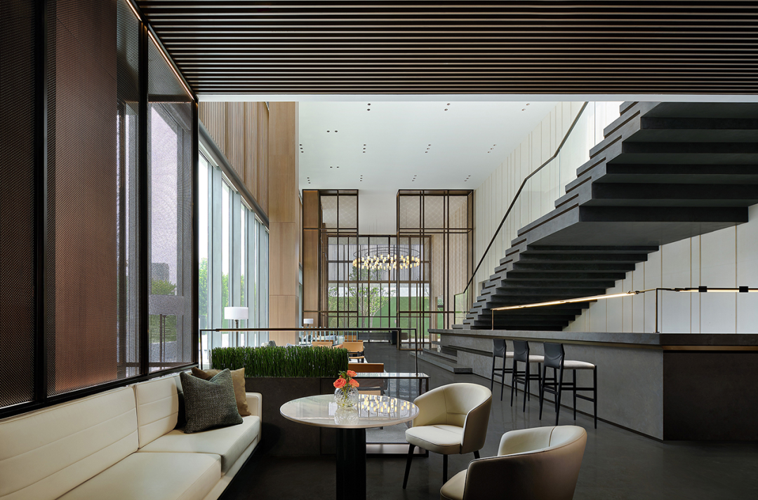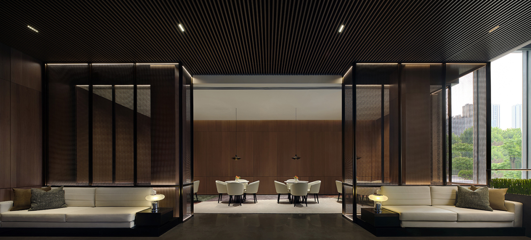 高挑空前厅内的定制金属屏风、木百叶与石材悄然间流露着东方意蕴,明朗且舒缓。吊灯则以圆形、线性、阵列式的重复元素强化仪式感,刚柔兼济,一派包容之意,气度非凡。