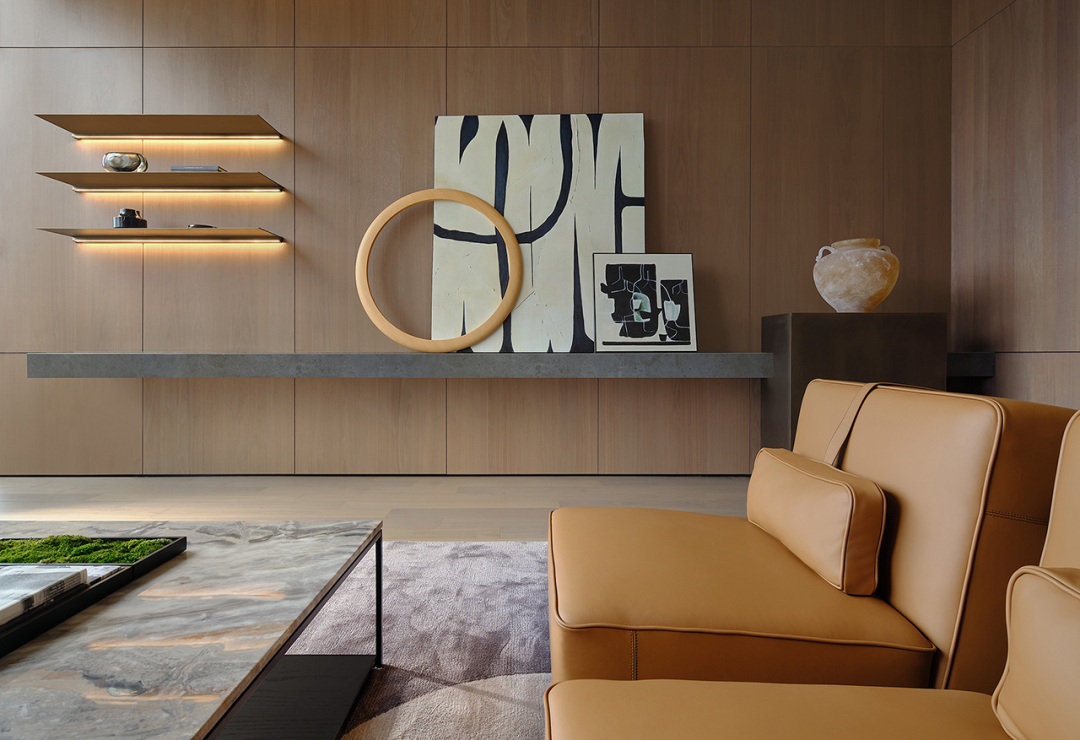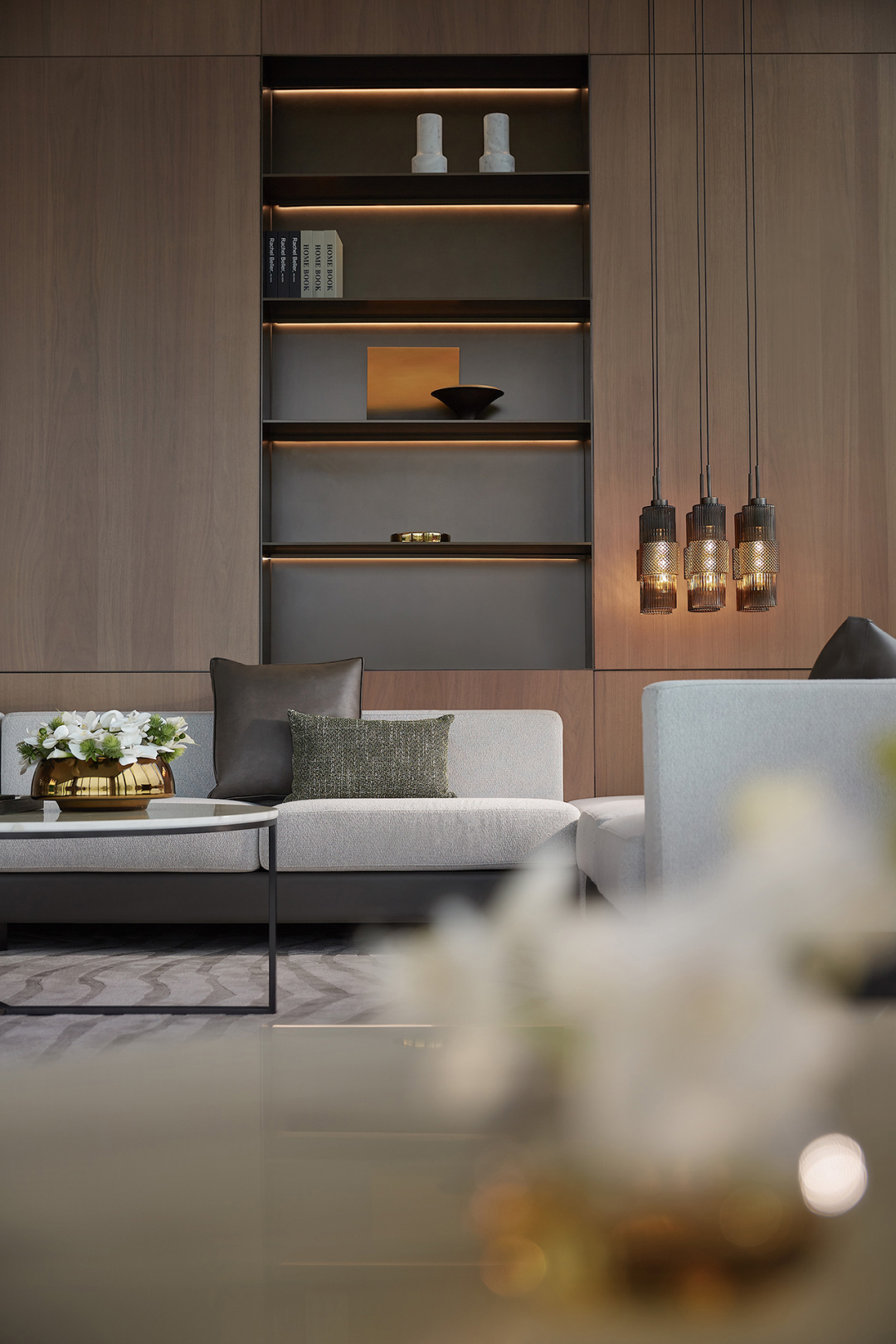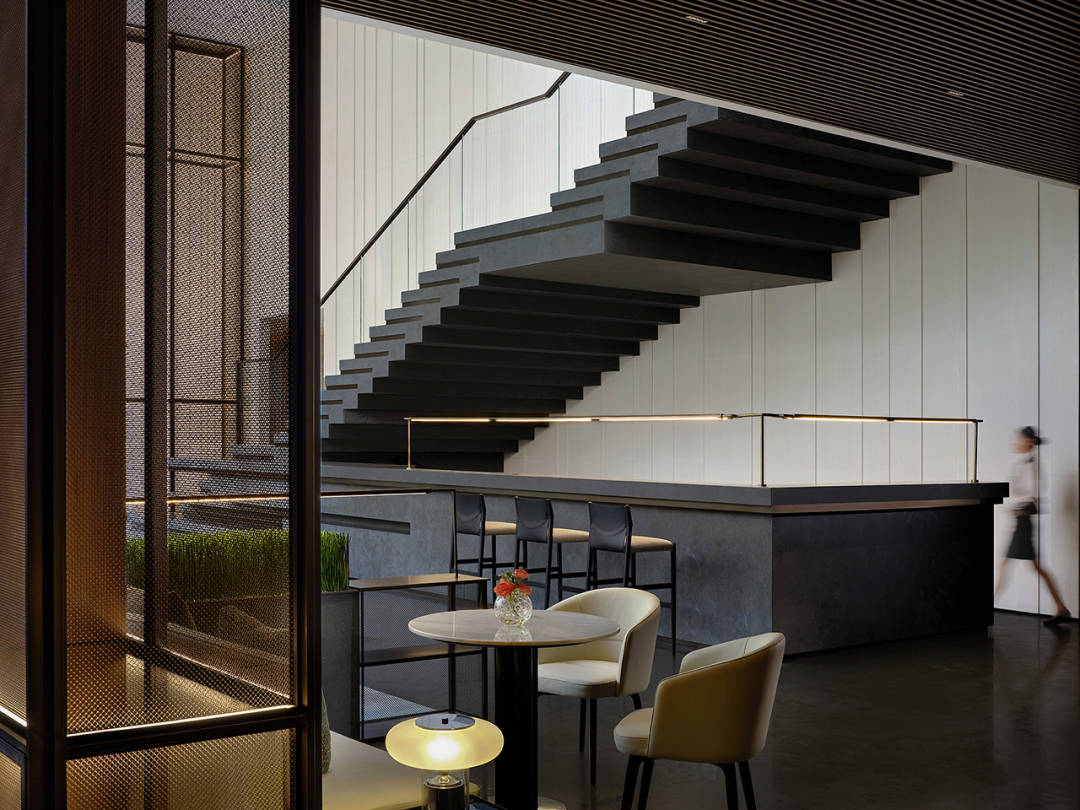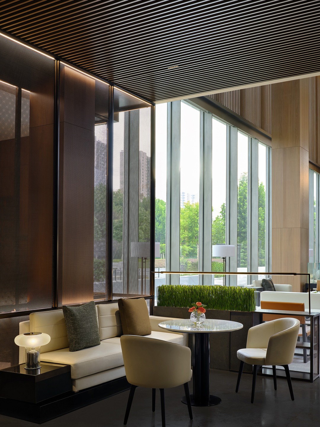 金属线条延伸至休憩区,这里不再大开大合,典雅的色度引导着思绪沉淀下来,落座一隅,温柔交互,理想都市生活的情趣与自由萦绕四周。