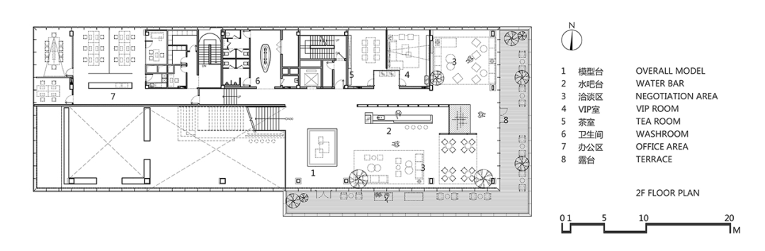 以克制手法将VIP室与自然相融,私密性与丰富度并存。金属板嵌入木饰面背景,不经意间投射出富有内涵的空间讯息;又加以三角构成手法,赋予此和煦、轻快的交谈氛围,共同释放其简约而不简单的风范。