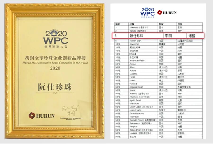 “阮仕珍珠”入选胡润百富《2020全球珍珠企业创新品牌榜》的第三名,与御木本、Tasaki等国际知名珍珠品牌位列前三。
