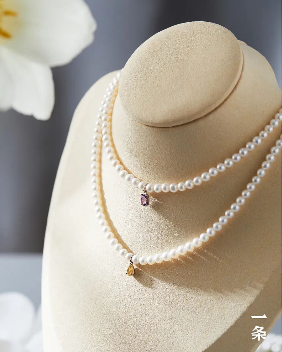 随着珍珠项链被演绎得越来越时髦,小颗的淡水珍珠也更受欢迎了。