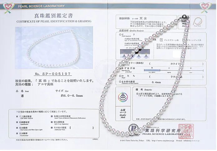 同时达到以上标准,成品才可获得“天女”的称号,并具有真珠鉴定所专门颁发的证书。