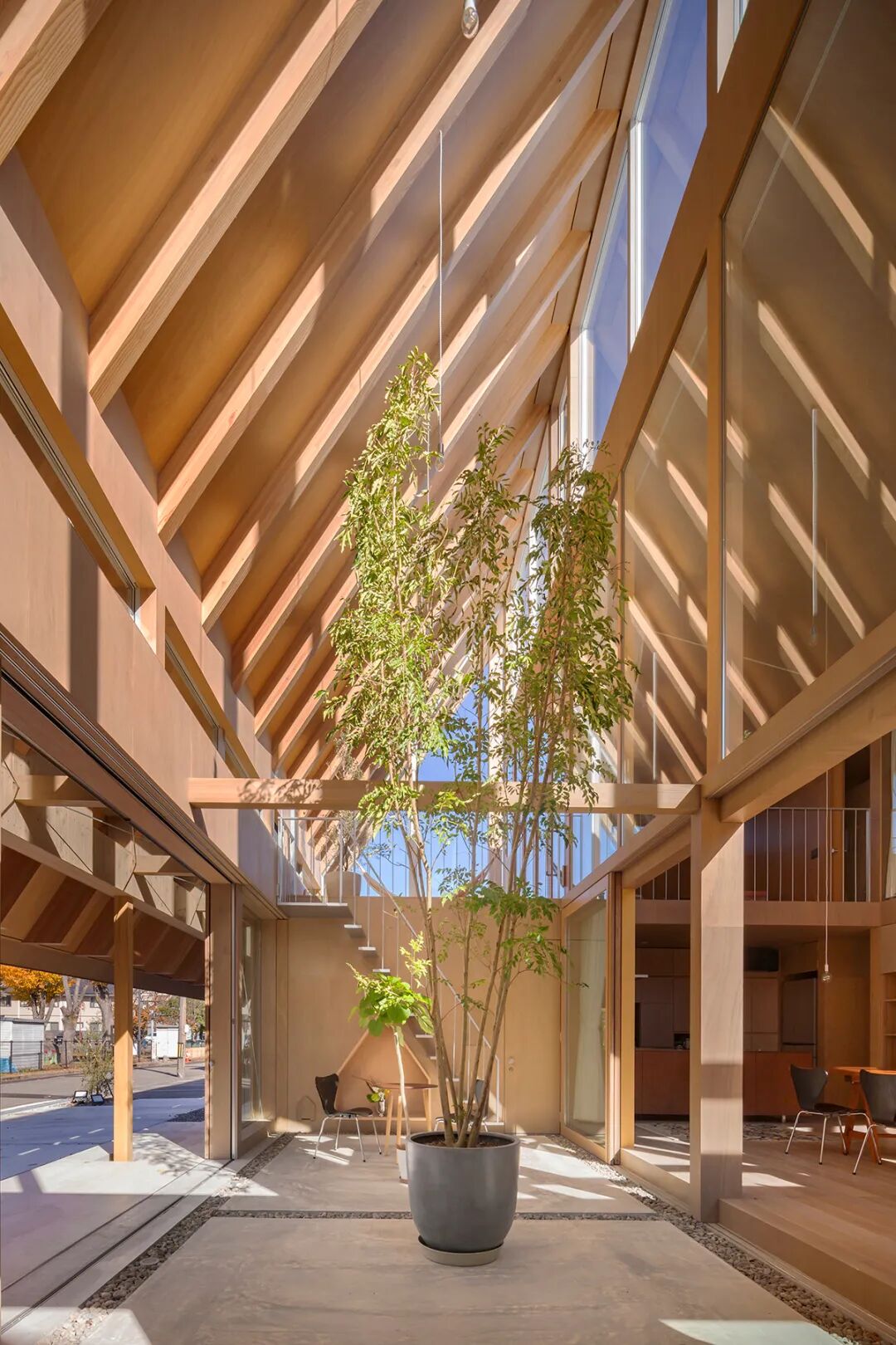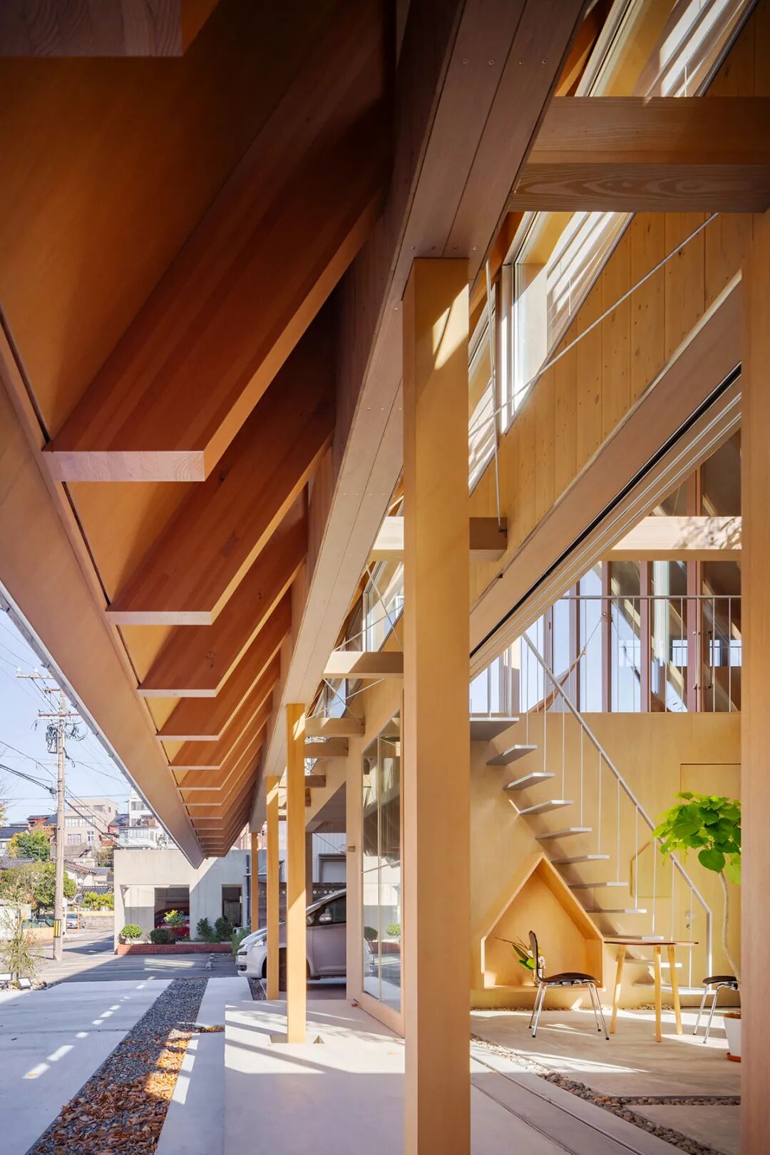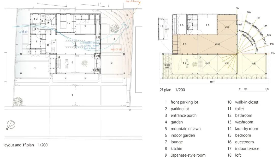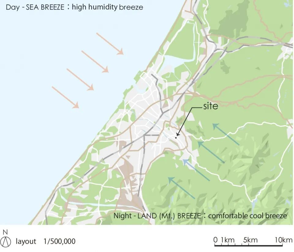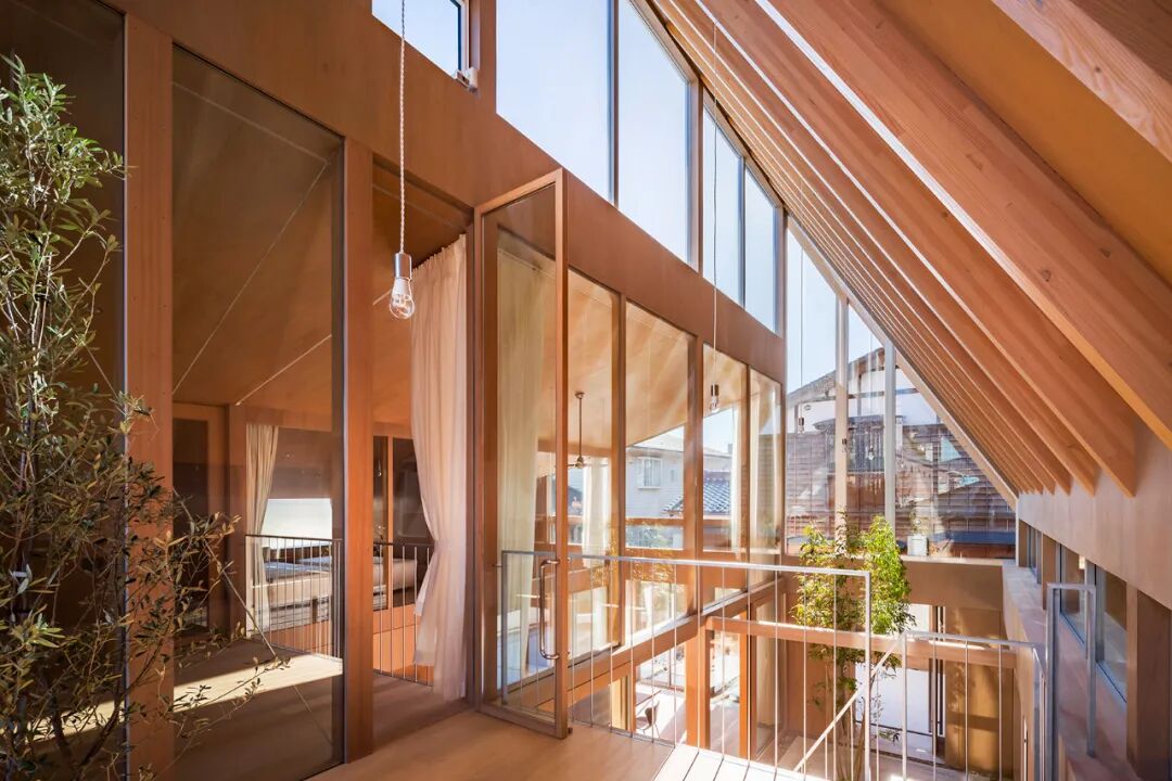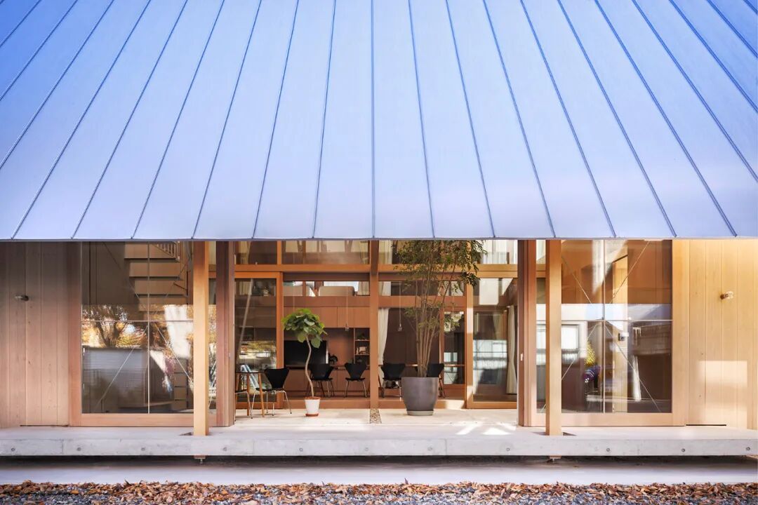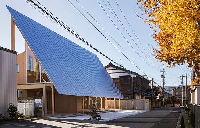 由于当地是日本雨天最多的地区,所以建筑以倾斜的大屋顶为主要特征,通过精心设计和一些环境以适应业主的生活方式,创造一个可以接触到光、风与自然共生的房子。