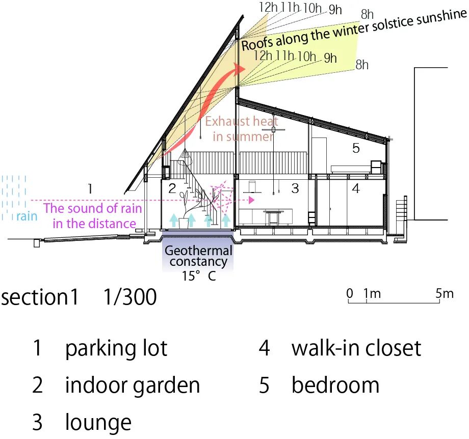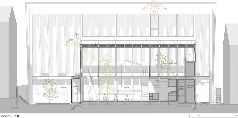 从剖面对建筑功能的分析可以看出,在这种操作下获得较大的高侧窗以满足在冬季阳光可以大面积的射入建筑中,而在夏季相对于大面积的玻璃带来的强光,屋顶的反射光则削弱了光线。临街的中庭具有了温室的效应控制室内温度。