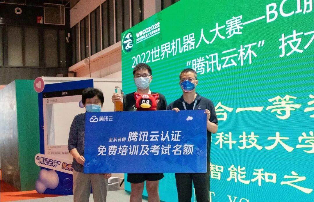 BCI 脑控机器人大赛「腾讯云杯」技术赛专家委员会主任&清华大学生物医学工程系教授高上凯、腾讯教育商务总经理罗盛为获奖者颁奖