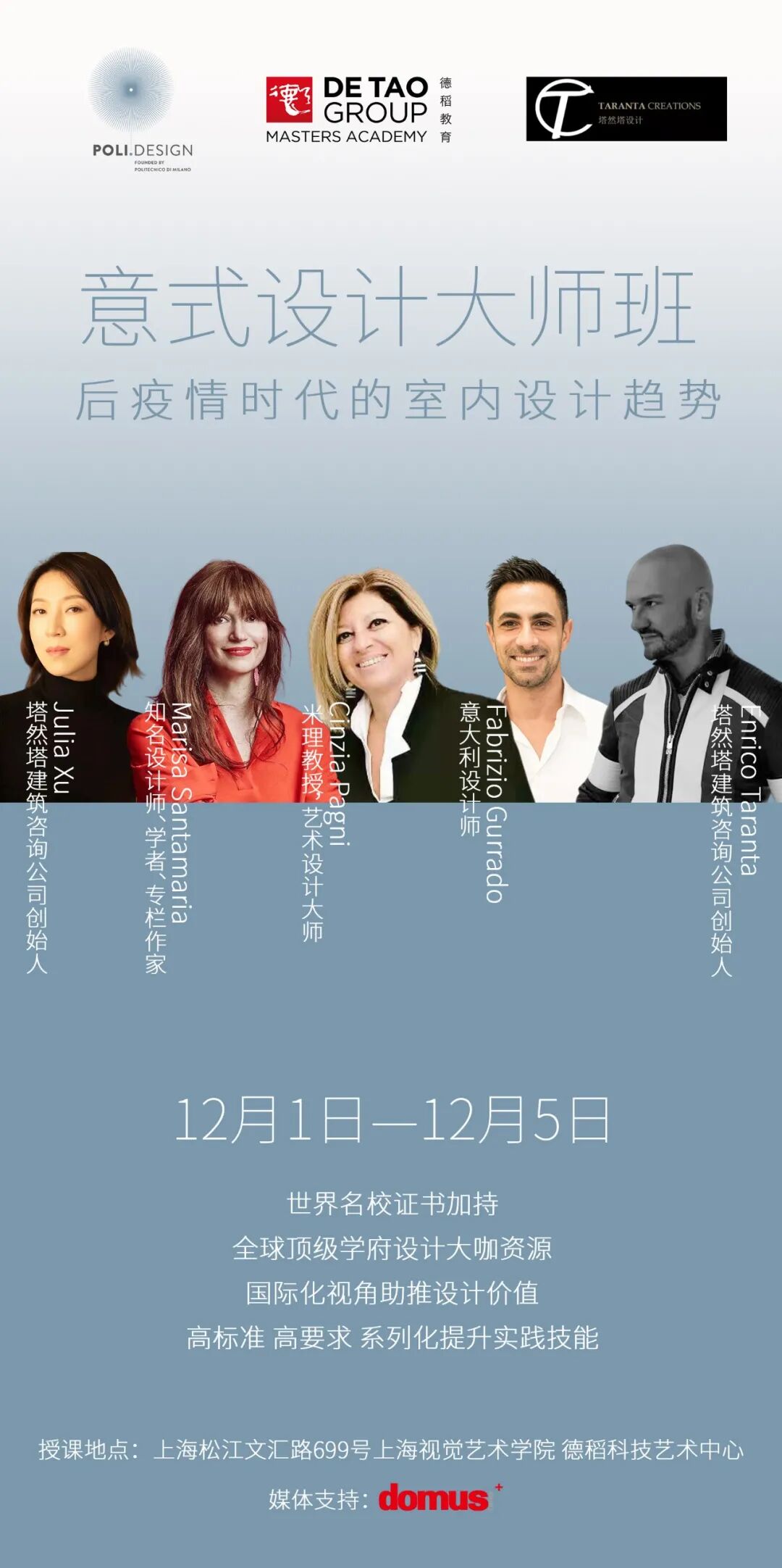 在此情境下,本中心及时顺应市场需求为国内设计界引入了世界排名第五的意大利米兰理工大学POLI.design设计学院精心为中国市场定制的“意式设计大师班 —后疫情时代室内设计趋势”系列专题课程。
