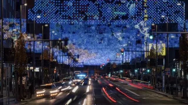 露西娅是小猫的名字,它偶尔会出现在固定的地点,似乎想要捕捉一闪而过的星星。作品覆盖了 1300 米的格兰大道,共包含 360414 个 LED 灯泡,总功率为 31 千瓦。