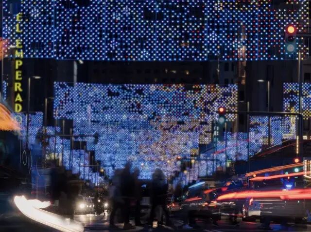 这是2018 年 Brut Deluxe 工作室在马德里格兰大道的临时灯光装置《天空中的露西亚》。