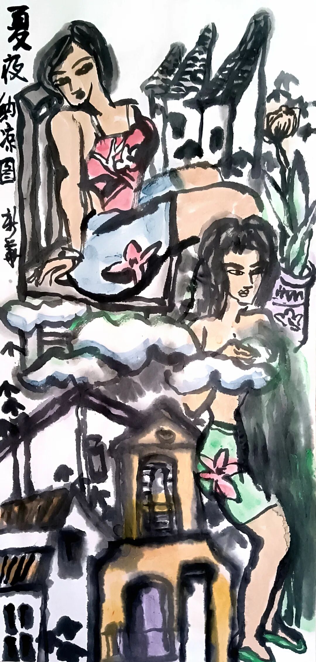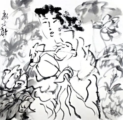 荷摇曳看花意,醉卧池塘轻歌起。端砚老墨研心性,笑傲清风柔笔写。惜颜春色轻着笔,淡抹莲房黄色洁。狂洒墨叶荷根力,亭亭玉立藏生意。
