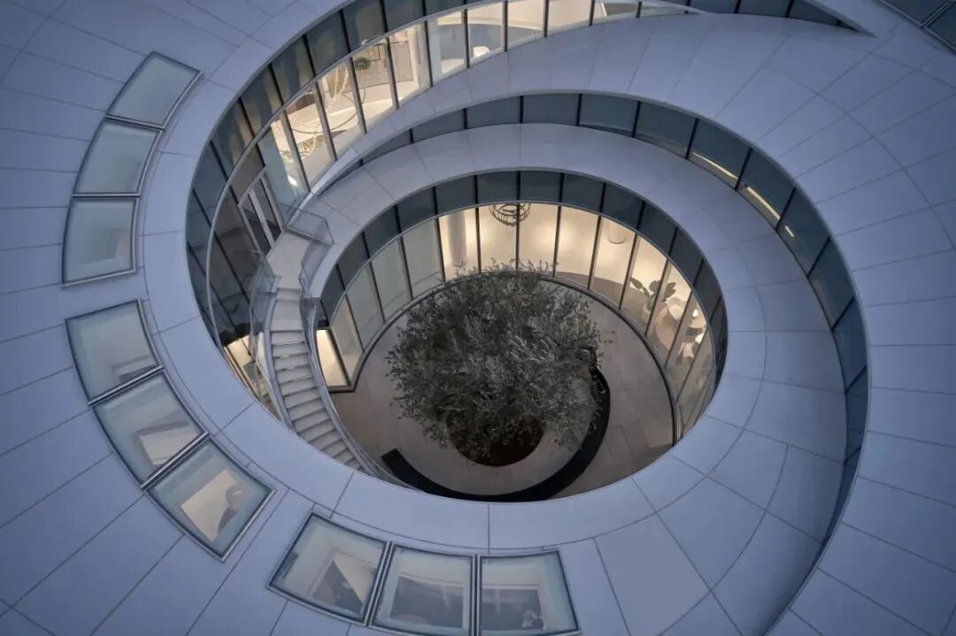 双螺旋交织的中心设计了内部庭院,这里既是外部空间形态的核心,内部的展示流线也是围绕此处庭院展开,形成了内外空间交互和交会的中心点。