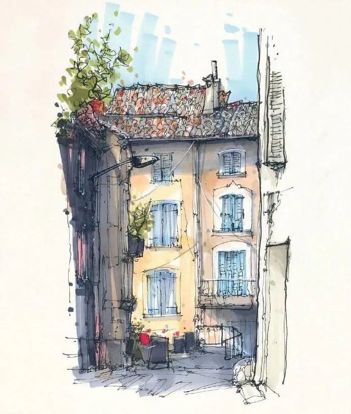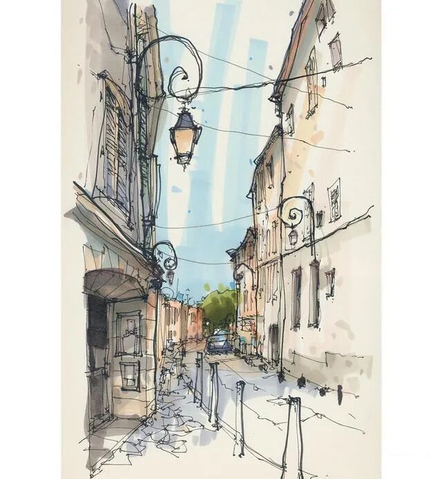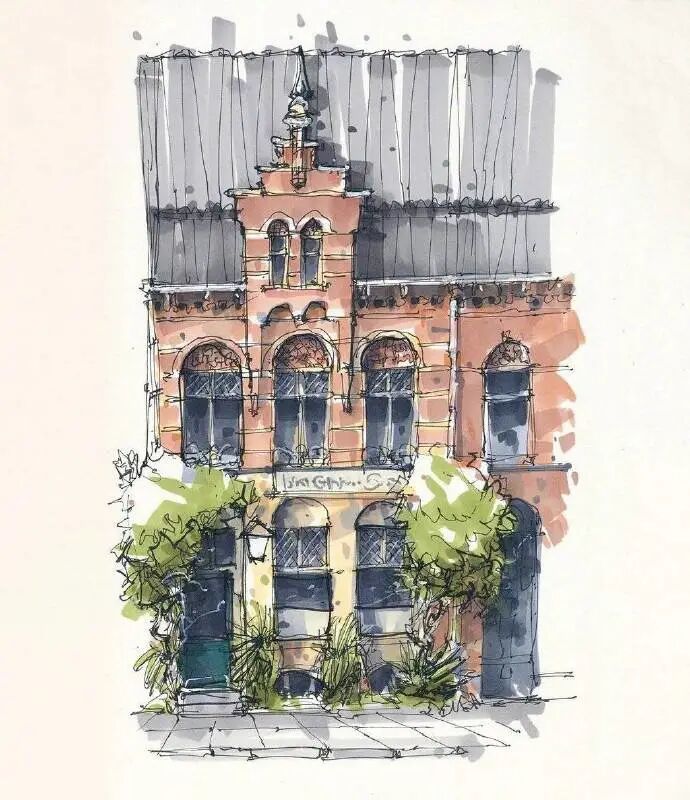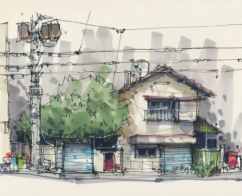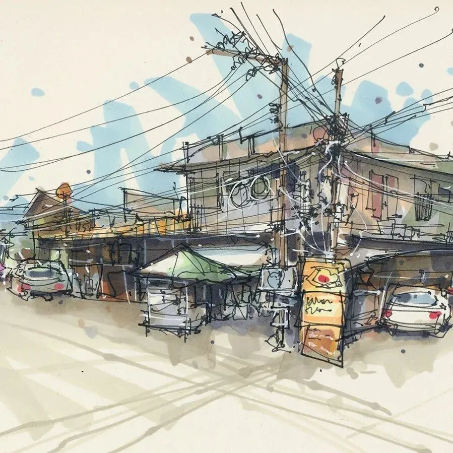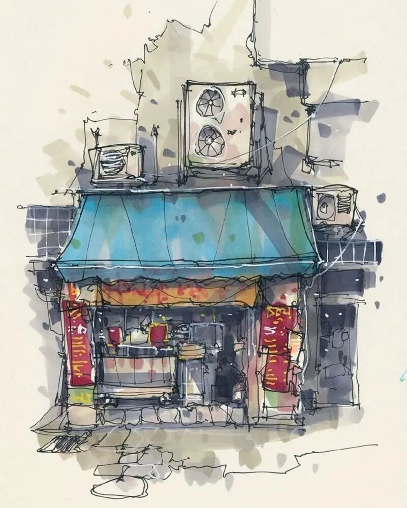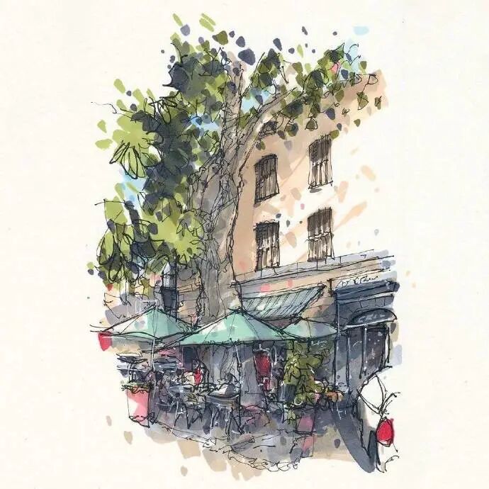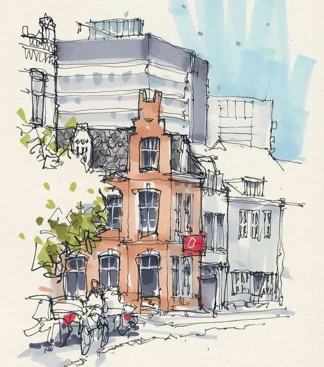 他没有专门地挑选标志性建筑来画,而是很随意地画一些街头小巷随处可见的小建筑。配色舒适清新,配上城市中安静的一角风景,让人感觉到岁月静好、温馨美好的感觉。速写的魅力就是可以用最快的方式记录眼中看到的一切,不需要我们很精雕细琢地上色、刻画,简简单单也能画出一幅很美的风景。