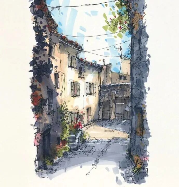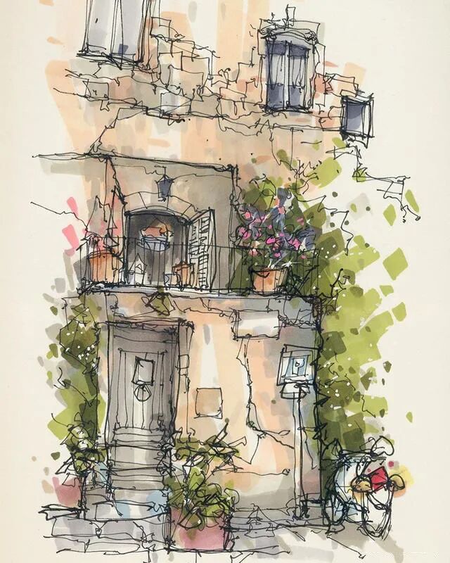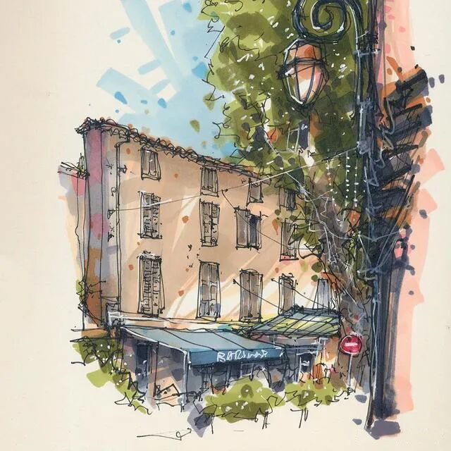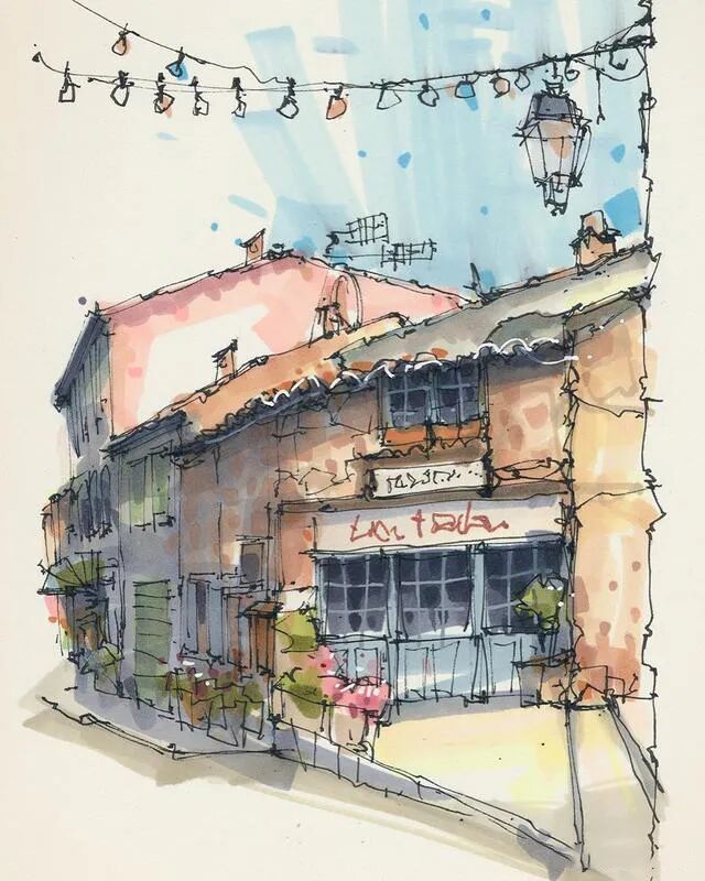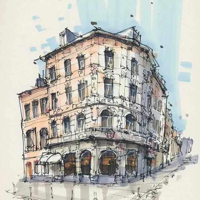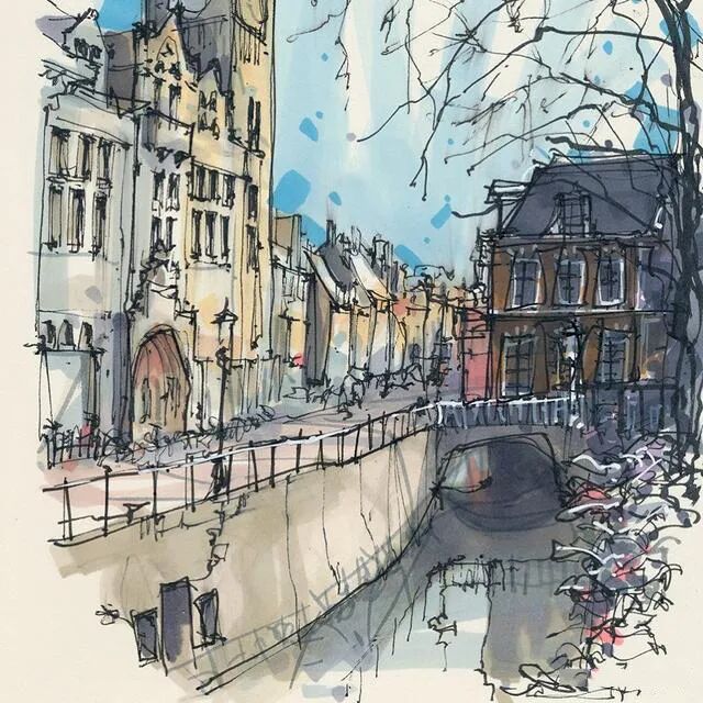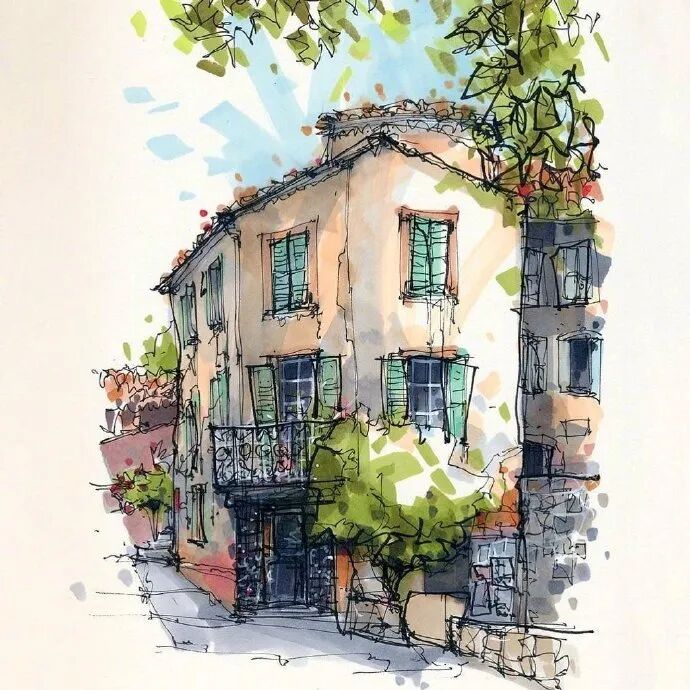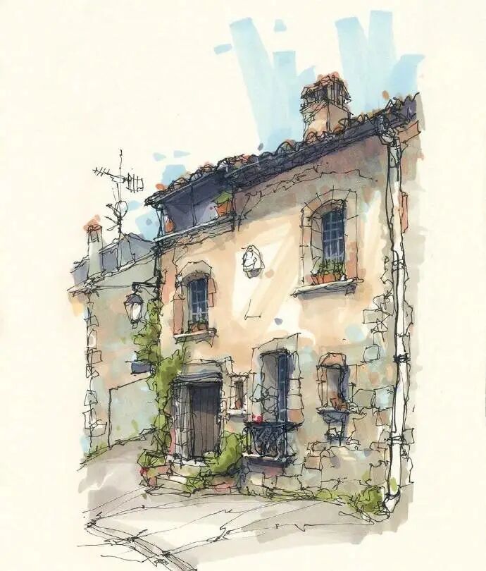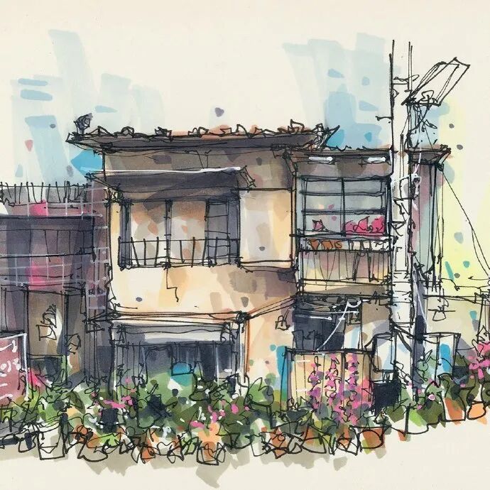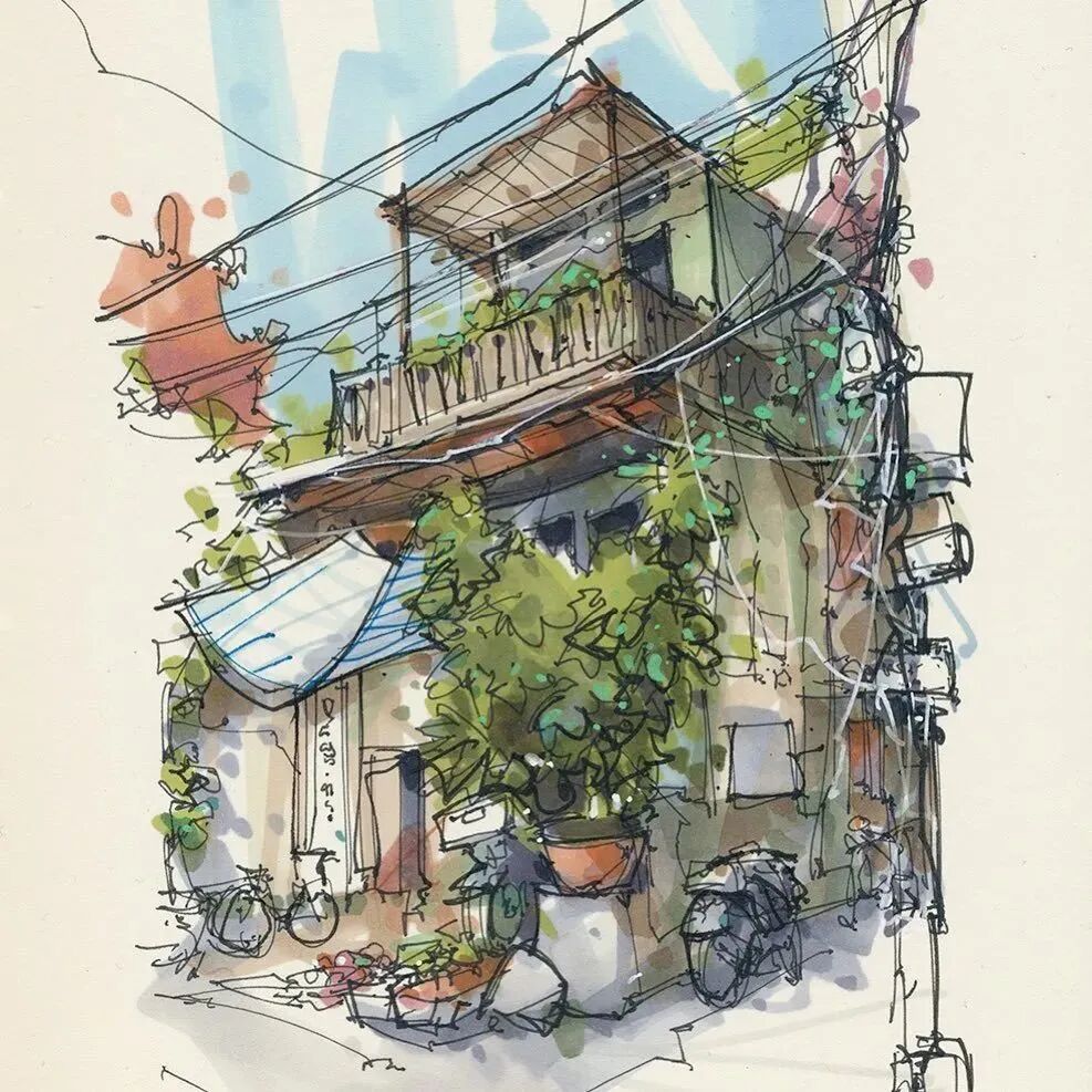 他没有专门地挑选标志性建筑来画,而是很随意地画一些街头小巷随处可见的小建筑。配色舒适清新,配上城市中安静的一角风景,让人感觉到岁月静好、温馨美好的感觉。速写的魅力就是可以用最快的方式记录眼中看到的一切,不需要我们很精雕细琢地上色、刻画,简简单单也能画出一幅很美的风景。