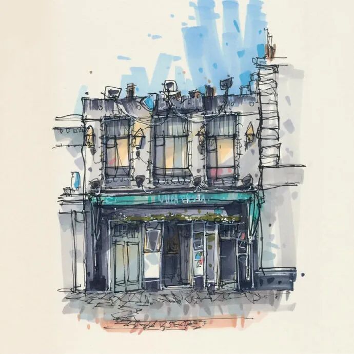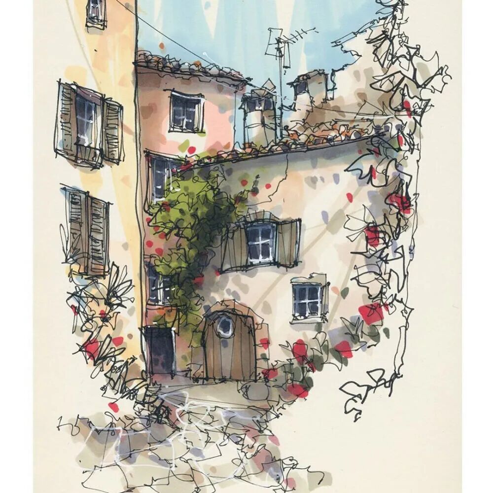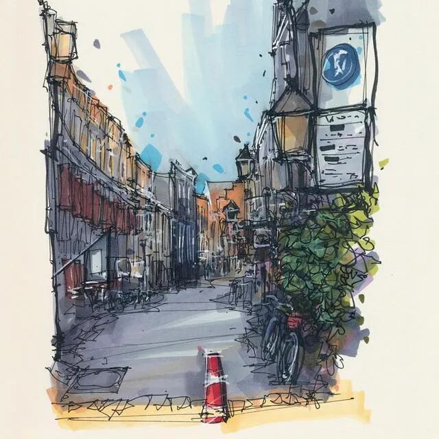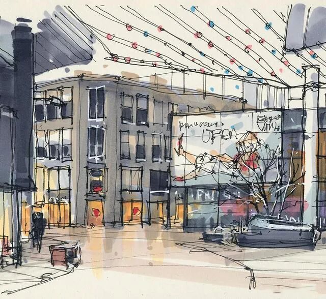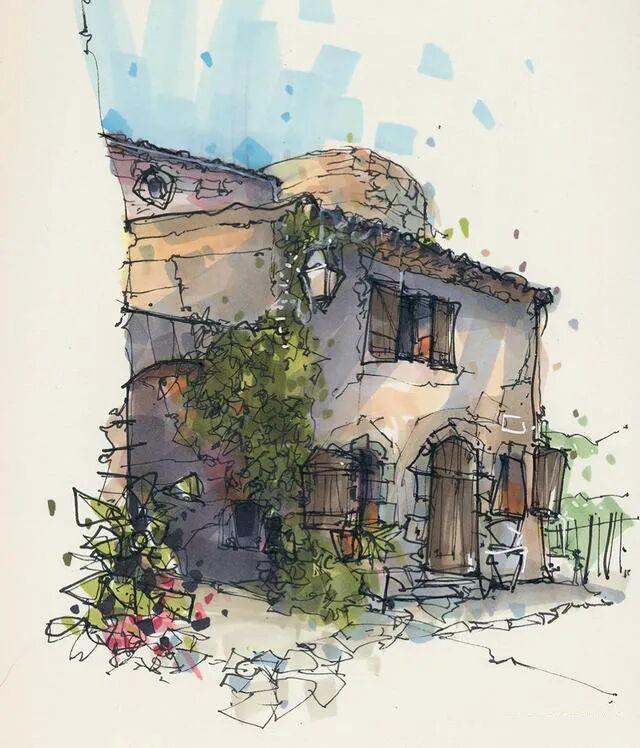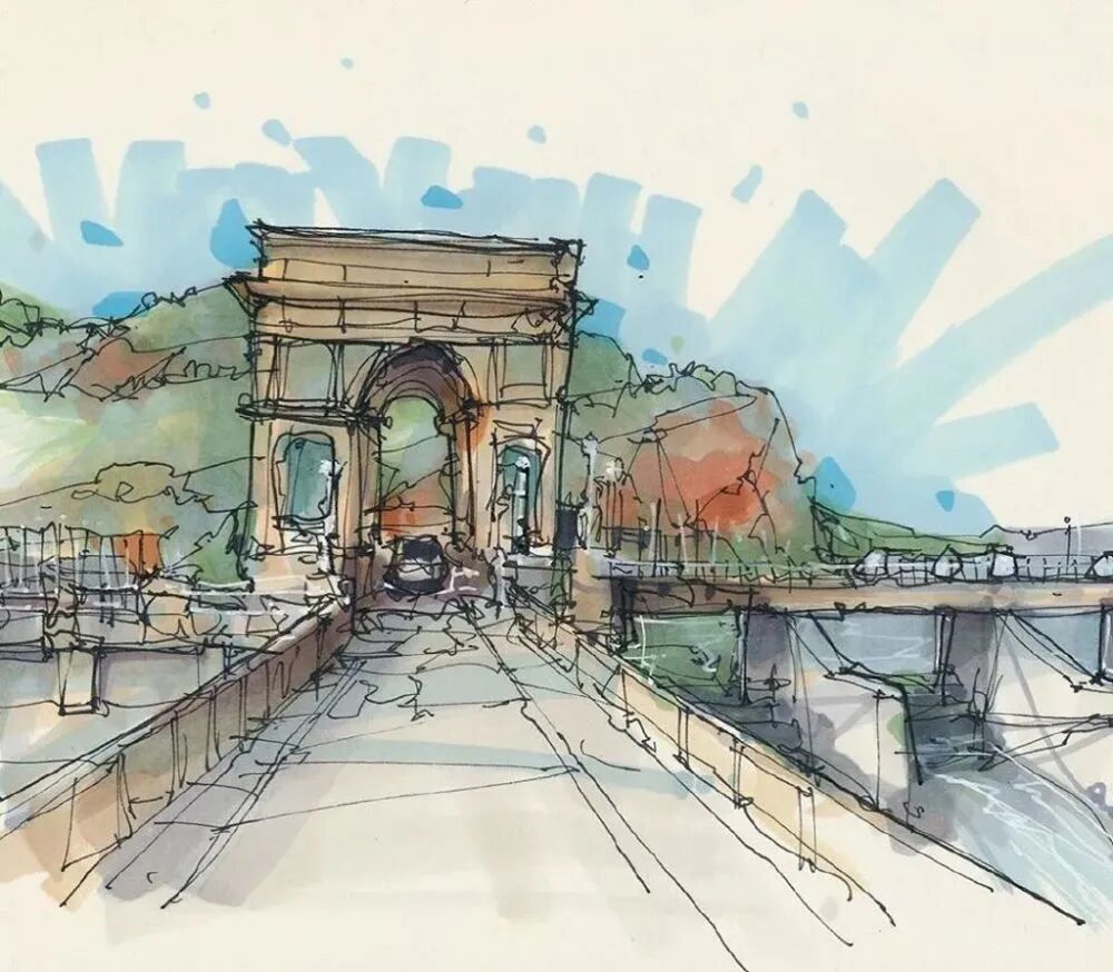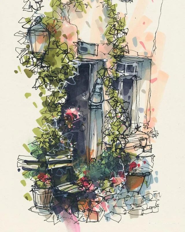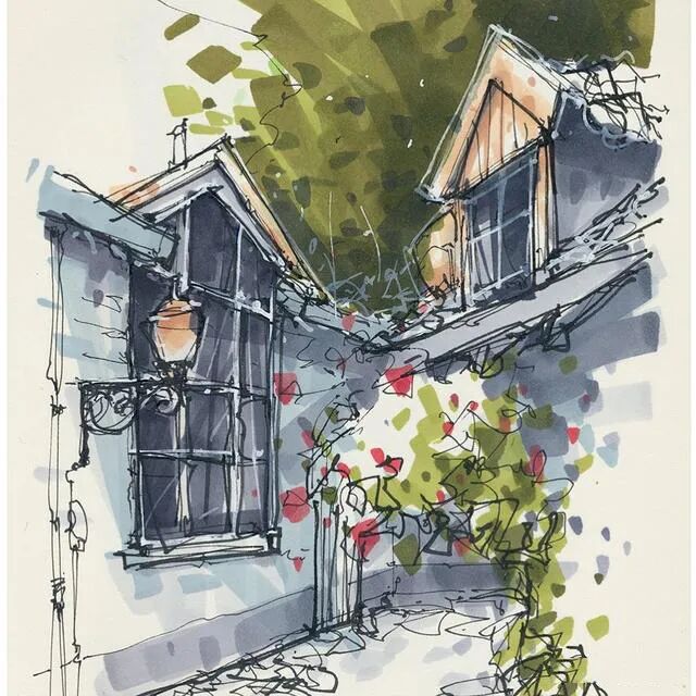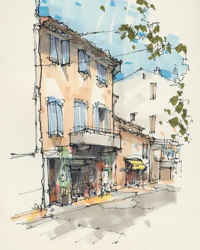 他没有专门地挑选标志性建筑来画,而是很随意地画一些街头小巷随处可见的小建筑。配色舒适清新,配上城市中安静的一角风景,让人感觉到岁月静好、温馨美好的感觉。速写的魅力就是可以用最快的方式记录眼中看到的一切,不需要我们很精雕细琢地上色、刻画,简简单单也能画出一幅很美的风景。