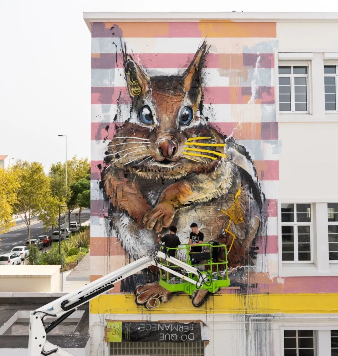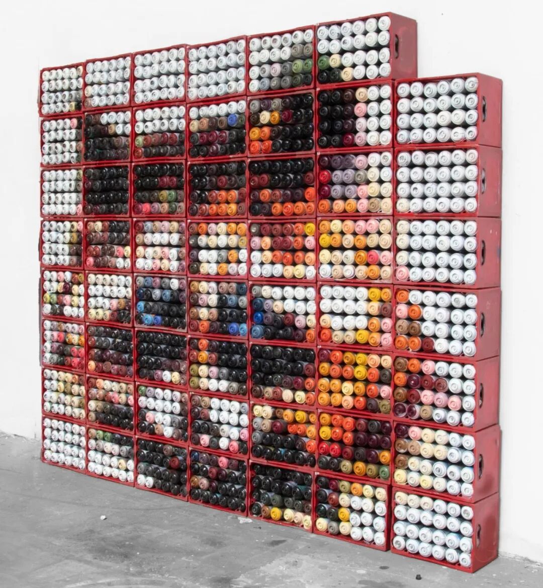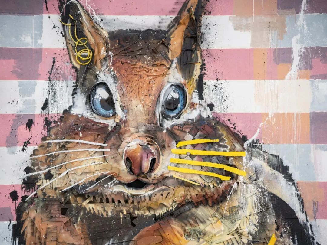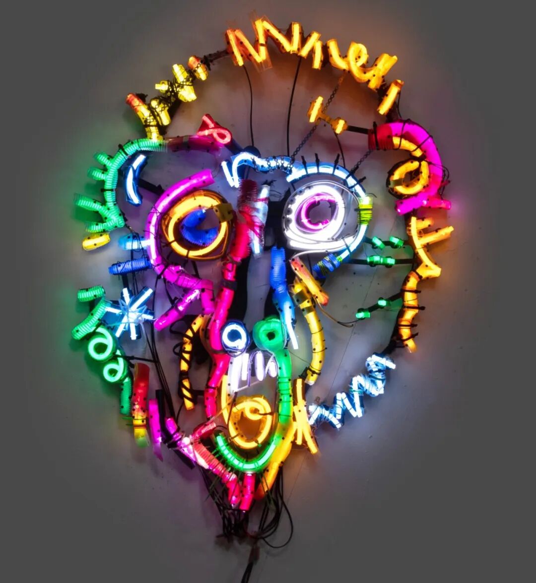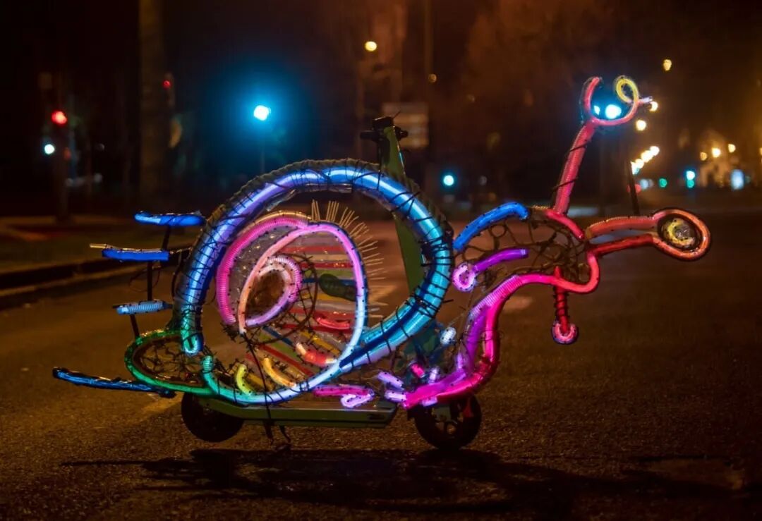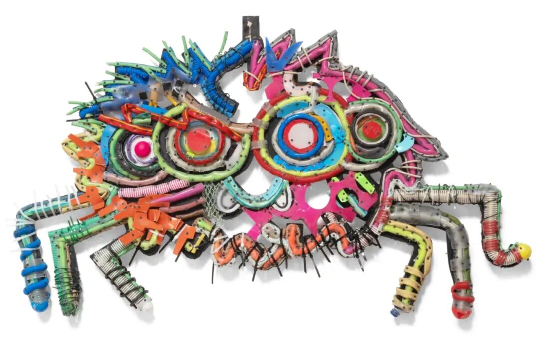 在这一系列作品中,所有的生物完全都是用废弃的东西组成,几百个易拉罐被他喷漆后,变成一只抽象的马赛克浣熊,霓虹灯管则照亮了一系列我们熟悉的动物,比如狐狸、蜘蛛以及绑在电动滑板车上的蜗牛等等。