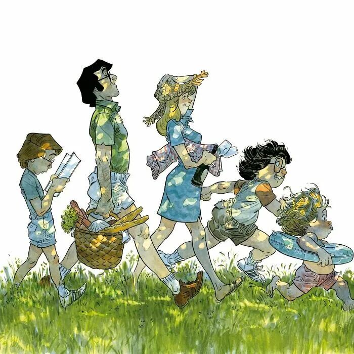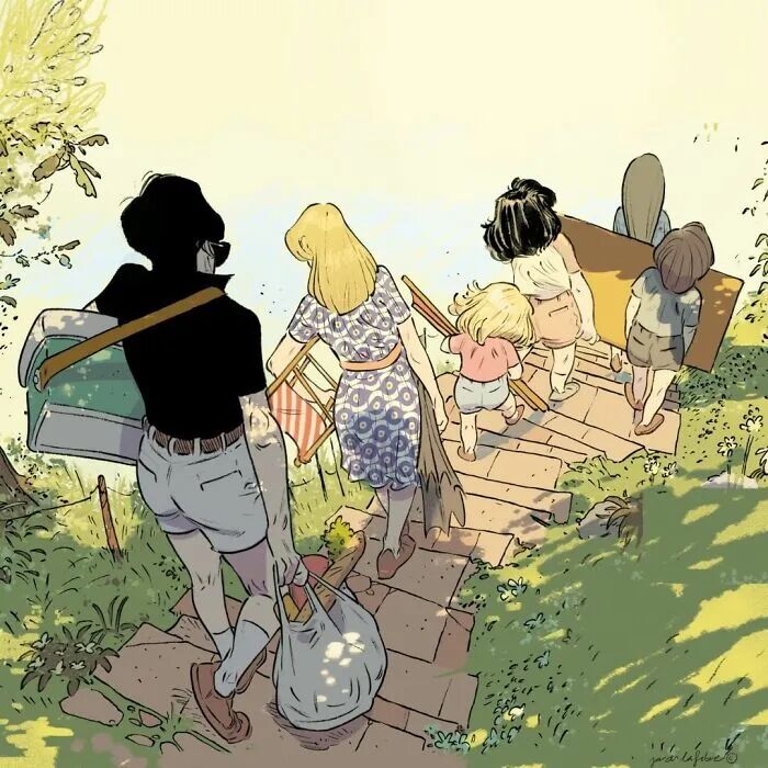 来自西班牙的插画家乔迪·拉费布雷,就为我们描绘了一个这样美满的家庭,画中明亮而纯粹的温暖满溢出来,让人看了就忍不住心生欢喜。艺术家笔下的描绘的就是自己的家庭,大都是在户外的场景,他们从不吝于表达爱,也不会满腹抱怨,永远是积极阳光的状态,其乐融融,一家人在一起,就是最幸福的样子。