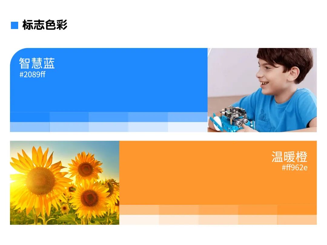 智慧蓝与温暖橙的组合打造品牌色,利于品牌视觉性统一,突显品牌差异点。