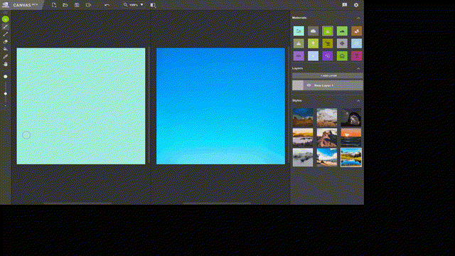 打开软件,你看到的会是一个中规中矩的绘画工具,左侧有包括笔刷在内的功能栏,包括不限于草地、雾气、云朵、雪花、山石等 15 种现实世界的材料。中间展示涂鸦和对应生成的实景,右侧从上到下则是材料、图层和风格。