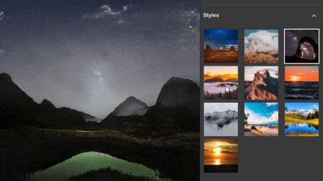 比如你要画一座山,只需素描个大致的山岭轮廓,GauGAN会相应组合生成一幅完整的山峰风景画,而你只需再调整下它用到的素材库,找到自己想要的风格就行了。