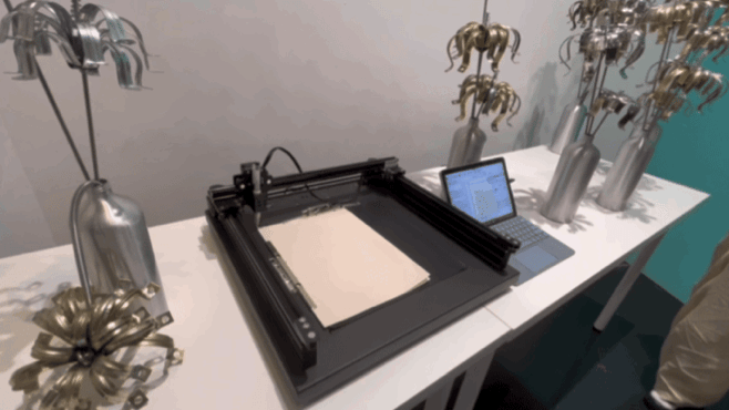 陶辉蒋若禹联合呈现的房间中摆放了一张放满金属花的写字台,在陶辉的装置作品中一台自动写字机书写着一封致父亲的书信,电脑输入字体与艺术家手写体的融合,机器造成笔尖的些许颤动让无人的书写依旧传递出情感痕迹;蒋若禹将之前艺术项目中留下的U形扣件与钓具组装成的金属花源自他在奶奶书桌的玻璃板下发现的一幅自己小时候绘制的图画,每朵花都维系着对亲人的怀念,这间布满冰冷金属与机械的房间也因此折射出藏匿在机器外壳下情感联结的温度。