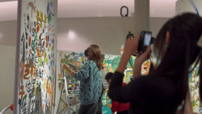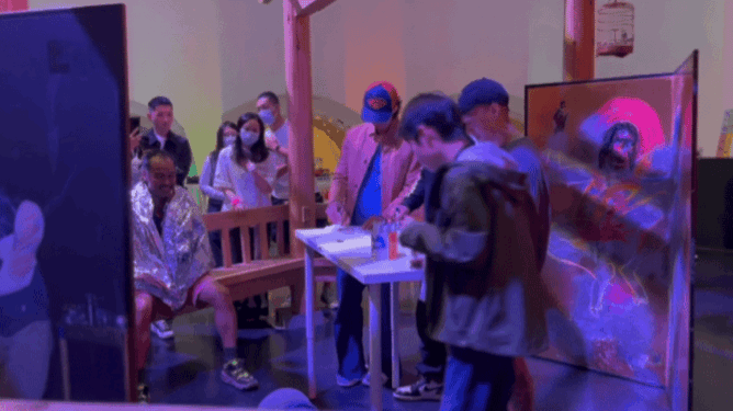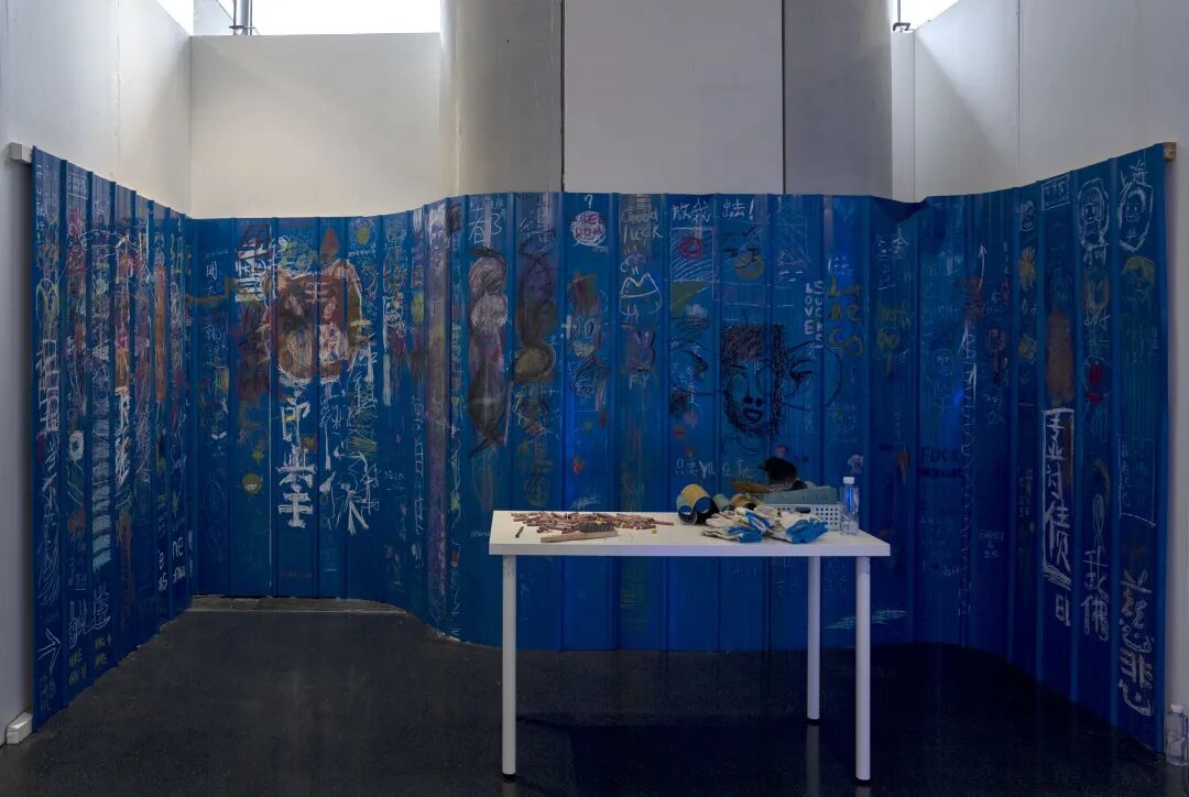 绘画、装置、影像,或是难以被界定的项目,艺术家带来了过去一年的工作成果,而他们对于房间的演绎也各具特色:售卖“苹果”周边的百货大楼(张晓),以假乱真的古早发廊(男士发浪),彰显艺术家真实身份的广告灯牌(林奥劼),或是只能通过小孔向内窥伺的神秘空间(郎港澳),不同的理念与实践在这里相互碰撞,以群体产生的聚合效应激活着新的艺术灵感;多样又好玩的互动项目则吸引观众深度参与到艺术创作中,一段能被肆意涂鸦和破坏的蓝色建筑围栏(秦观伟)、让人欲罢不能的“地摊风格”刮奖(武晨)和盲盒游戏(谭天)让艺术家和观众之间的交流共振得以直接地发生。