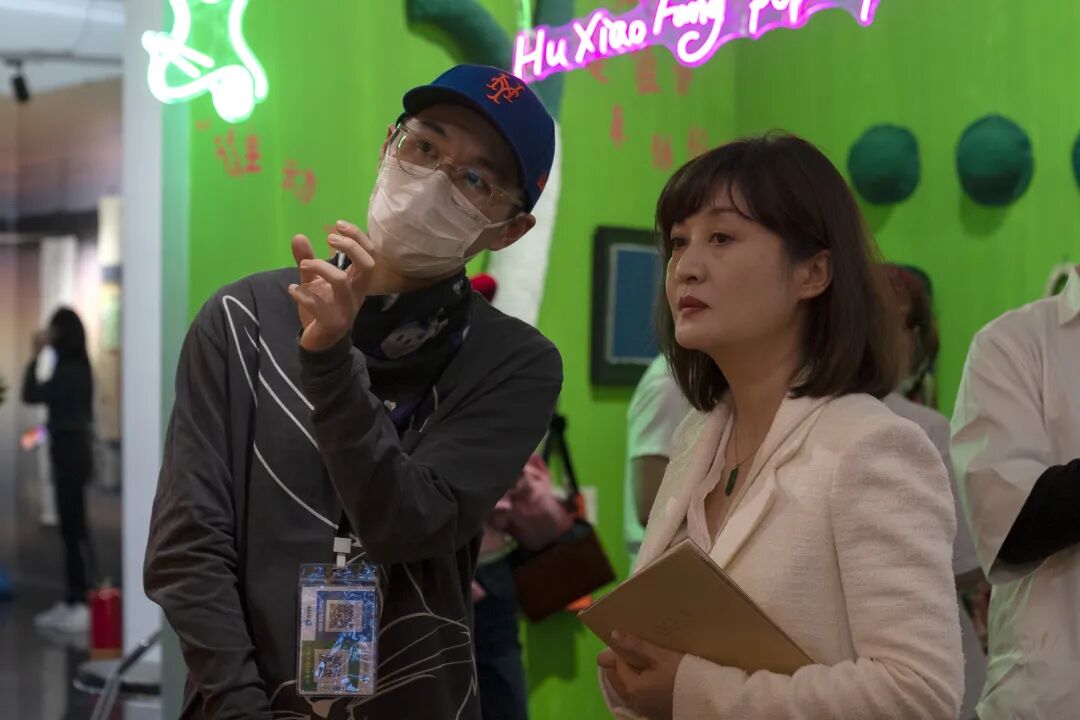 油罐艺术中心创始人及馆长乔志兵(右)在“油罐玩家艺术节2022”展览现场