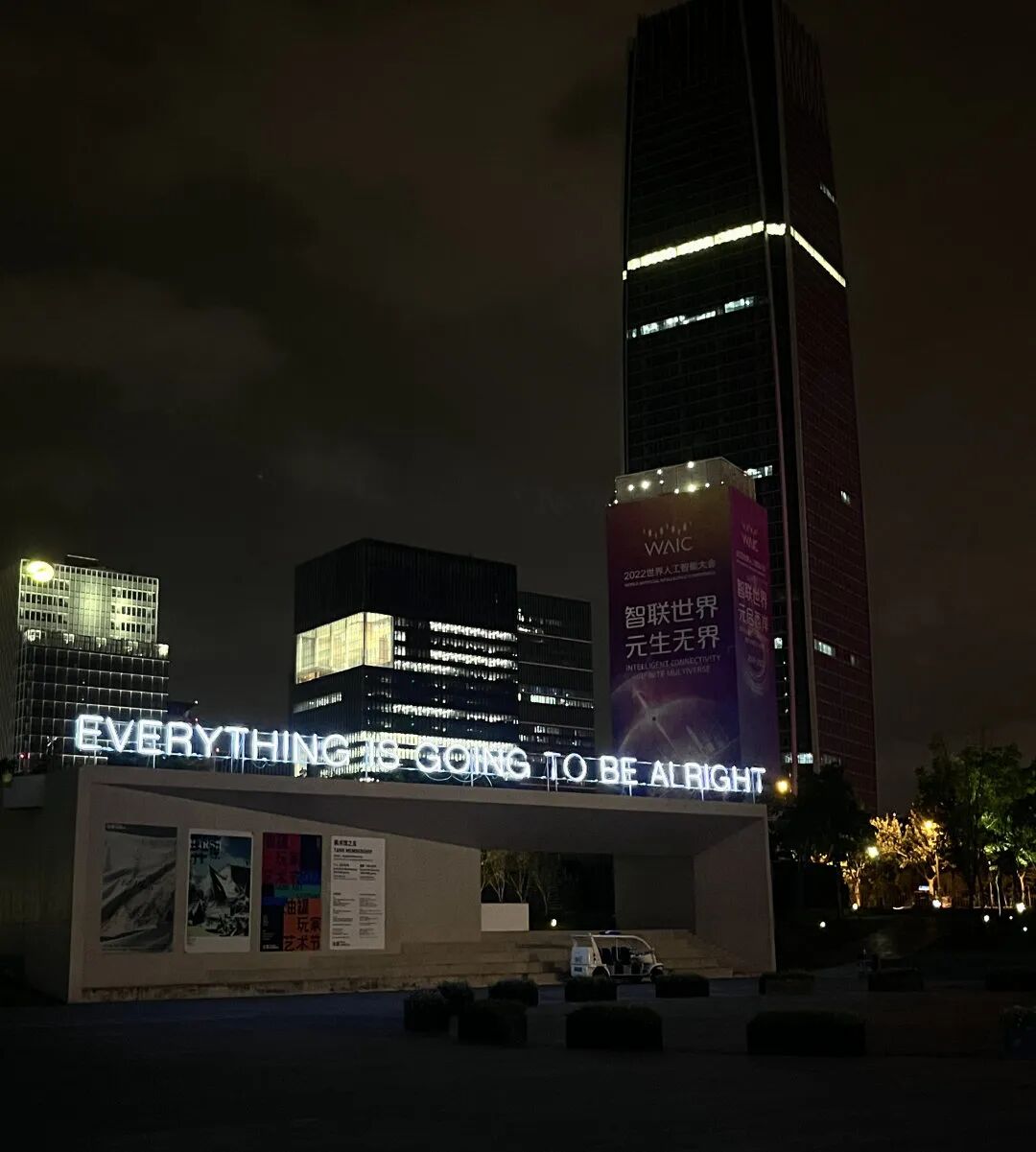 从艺术节的现场出来已经入夜,在油罐艺术中心的下沉广场上迎面正撞上发光的马丁·克里德的霓虹标语:“EVERYTHING IS GOING TO BE ALRIGHT” (一切都会好起来) ,在夜空中它柔和的光带来些许宽慰和希望,我想它已为三天的艺术节做了一个最好的脚注。