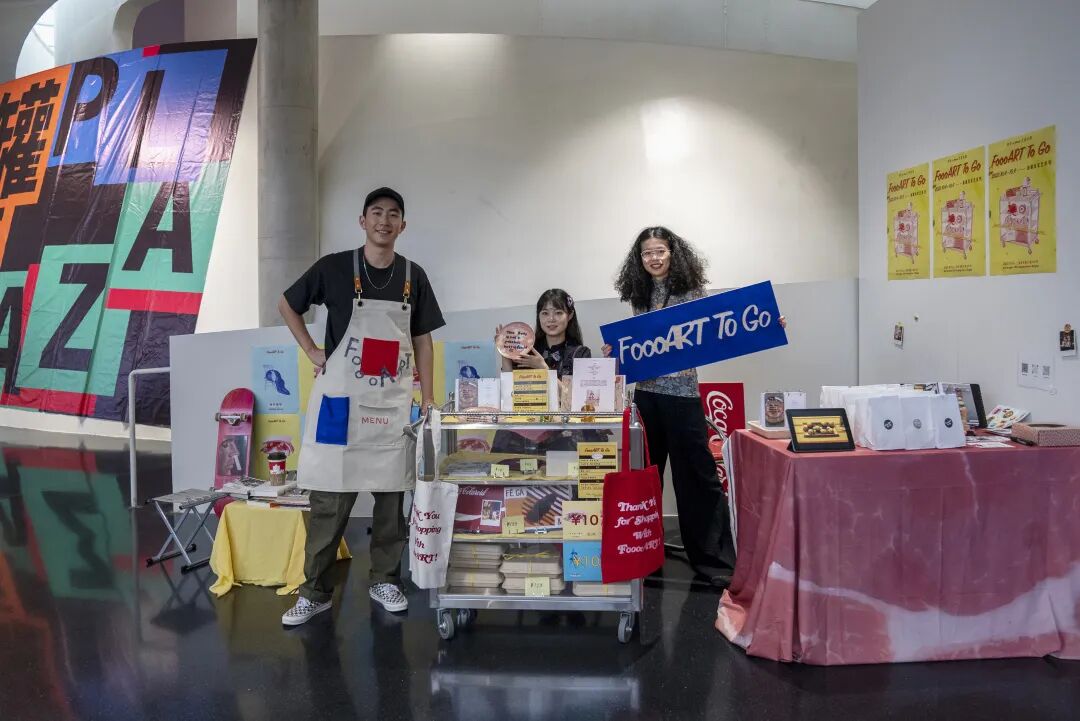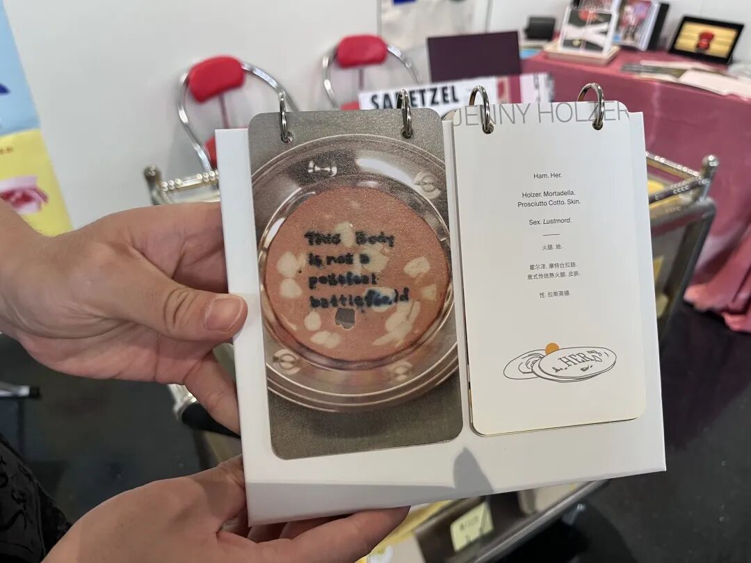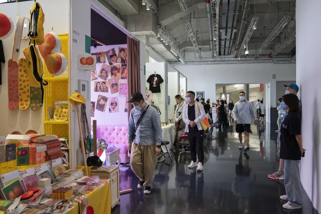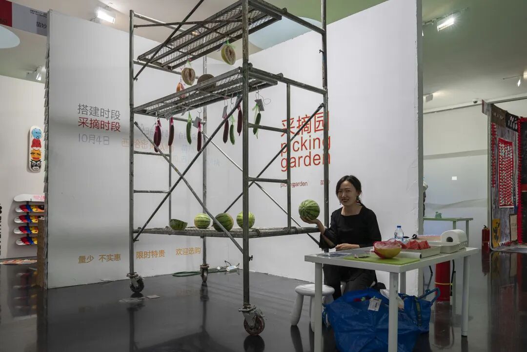 另几位艺术家也带来了与他们的创作和生活密切相关的作品与观众互动:苗妙基于其绘画中的两个关键词‘采摘’和‘悬挂’,利用布展现场的脚手架和每日购入的蔬果布置了一个简易“采摘园”,观众可以付费采摘和拥有水果,也可以坐下来免费分享苗妙赠送的水果;去年才成立的艺术小组梦多La Mondo将他们的创作化作一辆流动餐车,餐车上的食物是对珍妮·霍尔泽和萨拉·卢卡斯等女性艺术家经典作品的致敬,以乒乓球计分牌和食物图像结合的自制印刷品灵感则来源于今年格莱斯顿画廊于画廊周北京呈现的展览“明日之问”;尚一心王光乐合作的“房间”令人印象深刻,王光乐带来的“中国当代艺术圈徽章”来自于10年前为名为“摆摊”的艺术市集创作的作品,尚一心以隔离期间在阳台上看到的网格状楼宇为灵感将自己每日服用的维生素药片独立塑封,排布成矩阵模拟中心化的视角以此引发对生命重量的思索,每位观众可以以100元限购一粒。