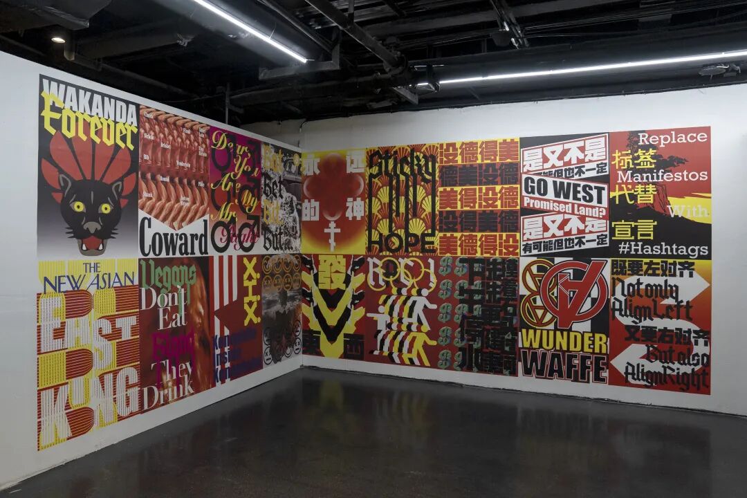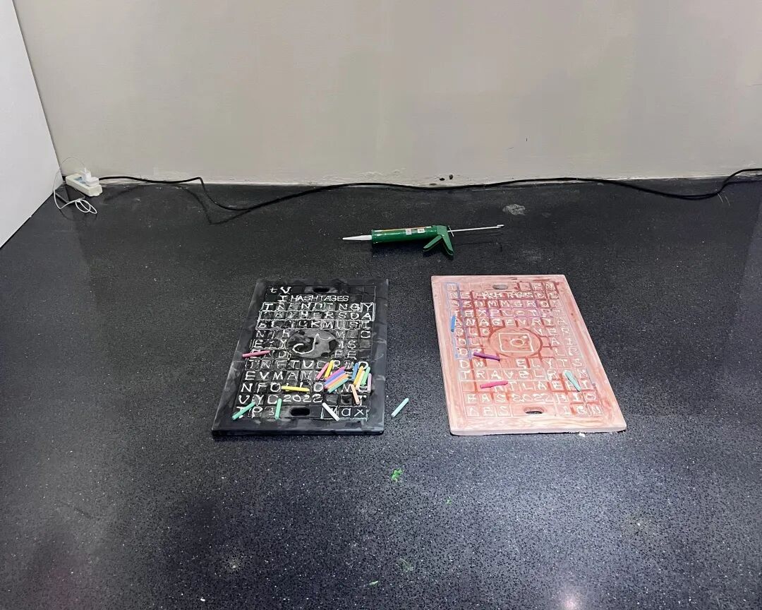 冯至炫带来了一组在井盖上进行的填字游戏,谜底皆为取自Tik Tok和Instagram两大社交媒体平台的热门标签 (hashtag) ,当这些热搜词条脱离其原始语境,它们的无关联性让人最终难以完成字谜,文字出现在作为临时性材料的井盖上反差地显示出如同古墓机括般的质感。在创作中冯至炫始终追求以一种物质性的手感抵抗数字化下非人性的存在,李汉威与施政的创作则走向了截然不同的方向。