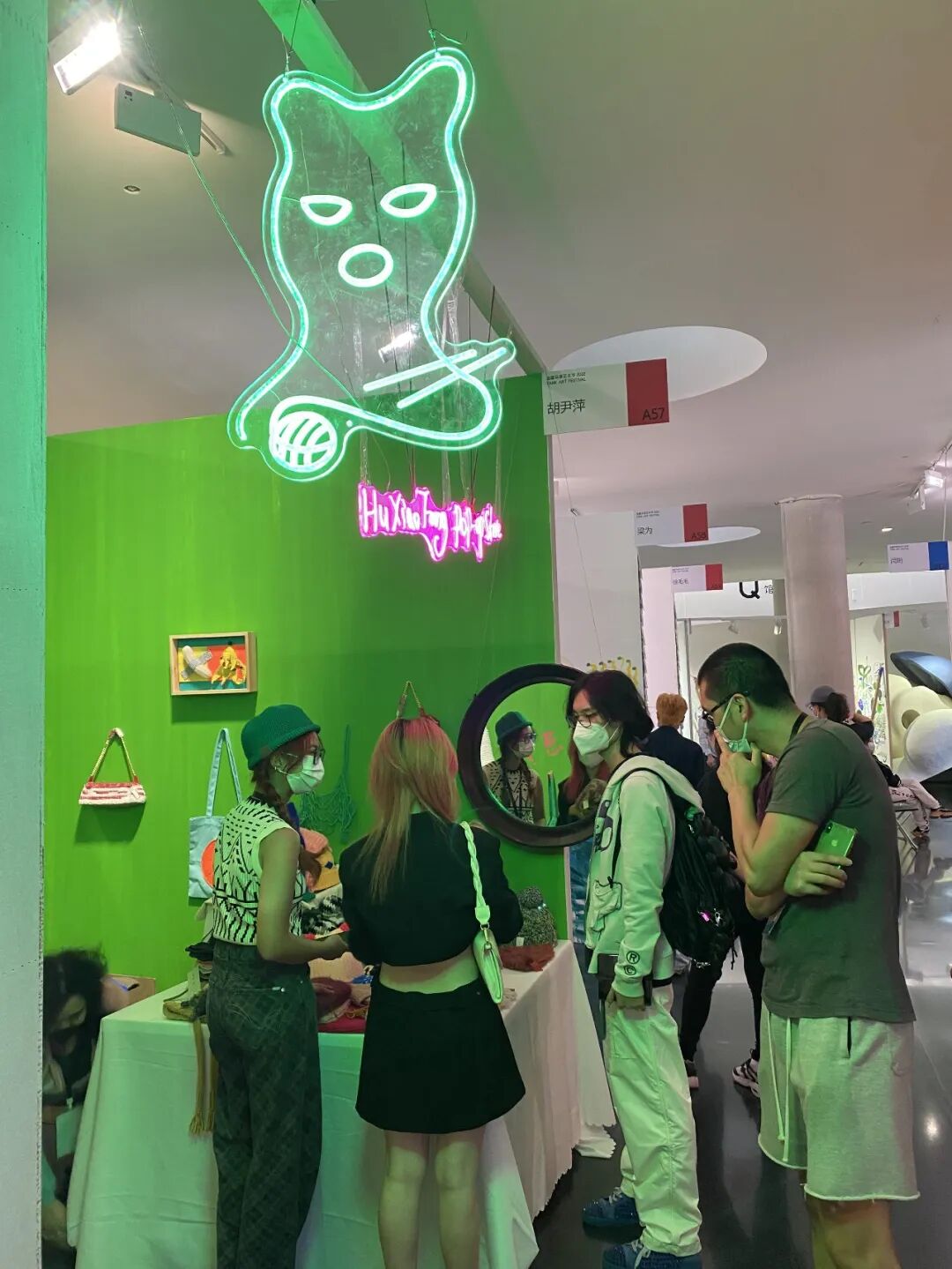 对一些艺术家而言,“油罐玩家艺术节”是一次实验的机会,但更是一个与其他艺术家不可多得的相聚时刻。周轶伦、李明、宋元元、唐狄鑫、胡向前、奶粉zhou等几位来自不同城市的艺术家好友每年就因为玩家艺术节得以相聚上海,并在几天的时间里相约一起爬山、喝酒,今年他们各自带来了独立又有互文的项目,同时也利用二层“罐装广场”的空间进行了一场即兴作画的合作演出;杭州艺术家空间“马丁·戈雅生意”今年则第四次来到了玩家艺术节,以猫头为标志的展位“猫庙4.0”闪烁着异色的光线,似乎是进入宇宙异次元的神庙入口,艺术家白桃桃&PAPAPEPIA、詹琦、抑子、吴俊勇、菌类i3t创作的作品及艺术衍生品在展位中呈现。“马丁·戈雅生意”的主理人、艺术家程然谈到本次参加艺术节的感受时表示:“今年参加的人更多了,而最重要的是,在现在这个时刻其实特别需要这样的一个机会让大家能够聚合在一起。”