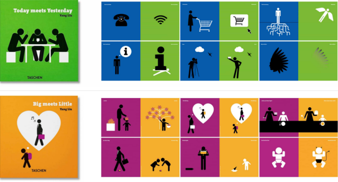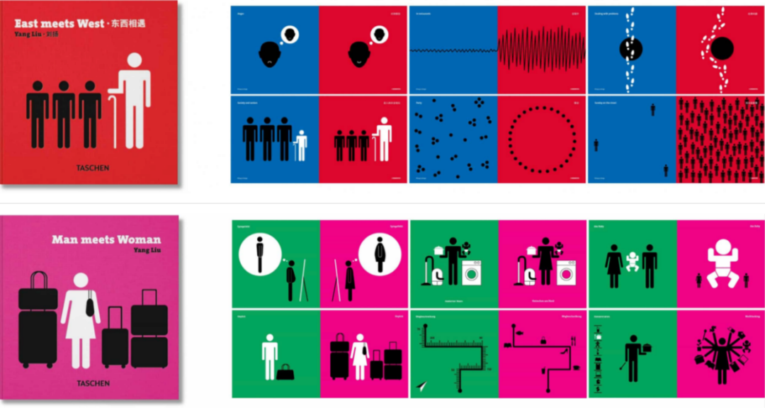 除了工作,刘洋的象形书“meet”系列是个人创作项目,并发表象形图系列丛书。其中最享誉国际、迅速走红,一夜之间成为畅销书的《东西相遇》,通过简洁的画风描绘中西方文化差异。后来陆续创作并推出“男人遇见女人”、“今天遇见昨天”、“大人遇见小海“、“欧洲遇见美国”。在她创作的所有图书中,都以自己独特的视角真实地报道了生活中耐人寻味的各种大大小小的差异,并且有其独特的幽默感。