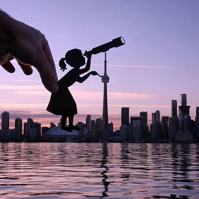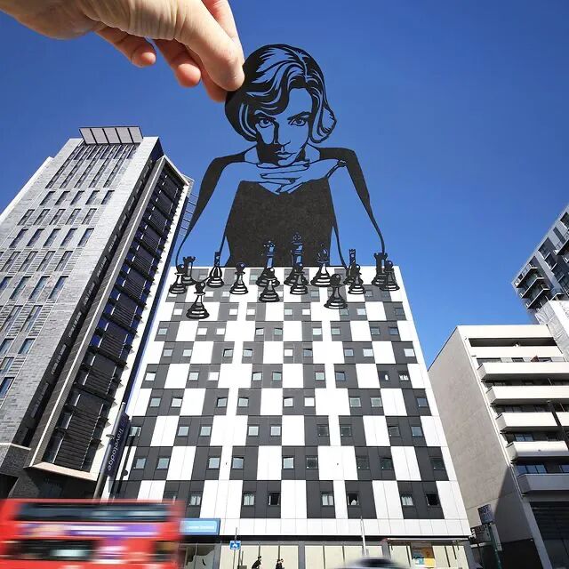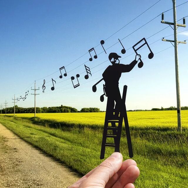 这个想法不仅帮助了他的艺术创作,还将剪纸艺术带到了一个新高度。在创作之前,他首先会观察,周围的环境与剪纸,能够进行一个怎样的互动,发生一个什么样的故事,然后根据自己的设想,去剪出相应的角色,最后将这个剪纸作品,放到周围的环境中,并在特定的角度拍摄下来,一个充满故事性和趣味性的创意场景就完成了。