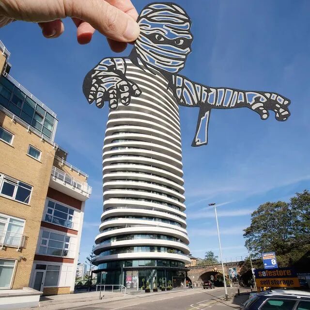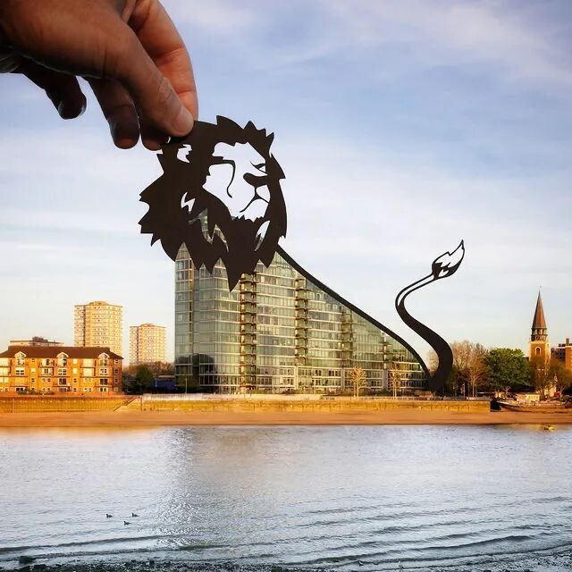 大家都知道,剪纸艺术一般是拿着纸和剪刀,在一个安静的环境里创作,剪完便是一个作品的终结。但是里奇·麦考却会将自己的剪纸作品与户外的建筑或景观进行一个结合,这也是他经常走出去,找到的创作灵感。