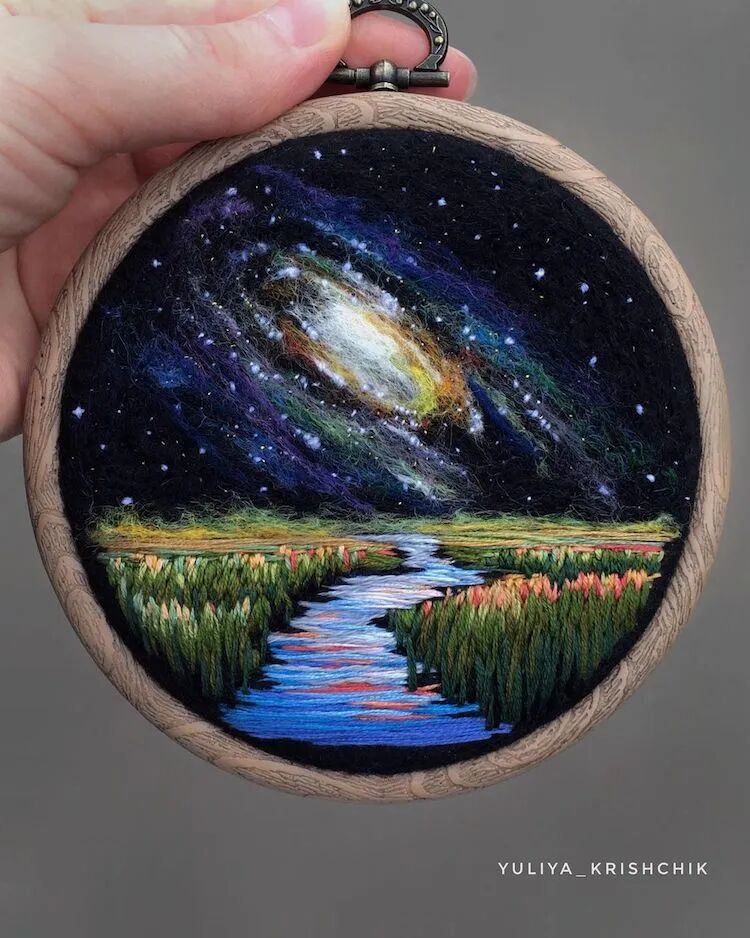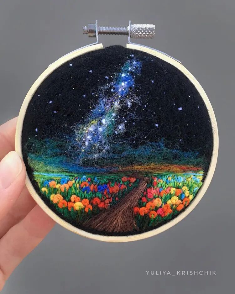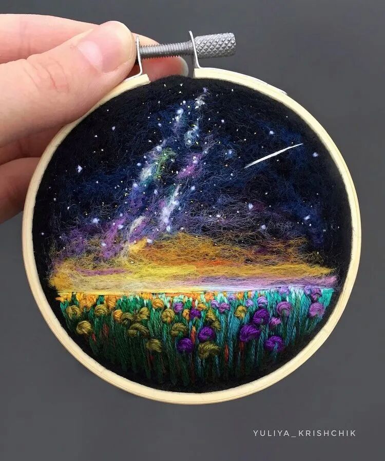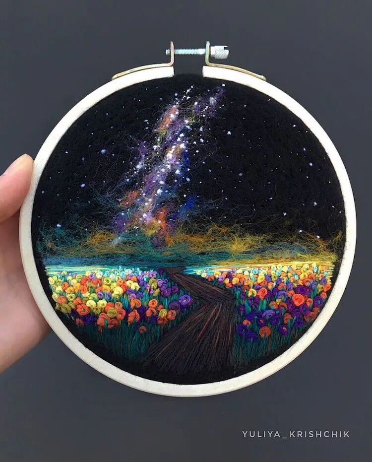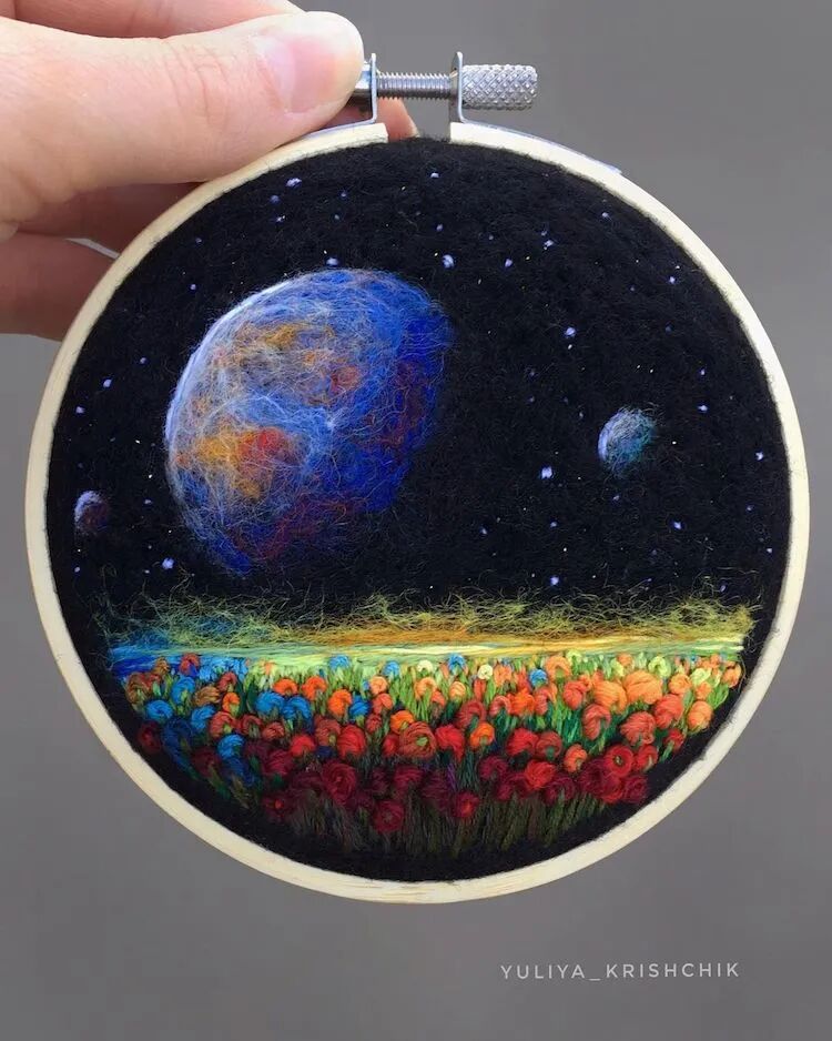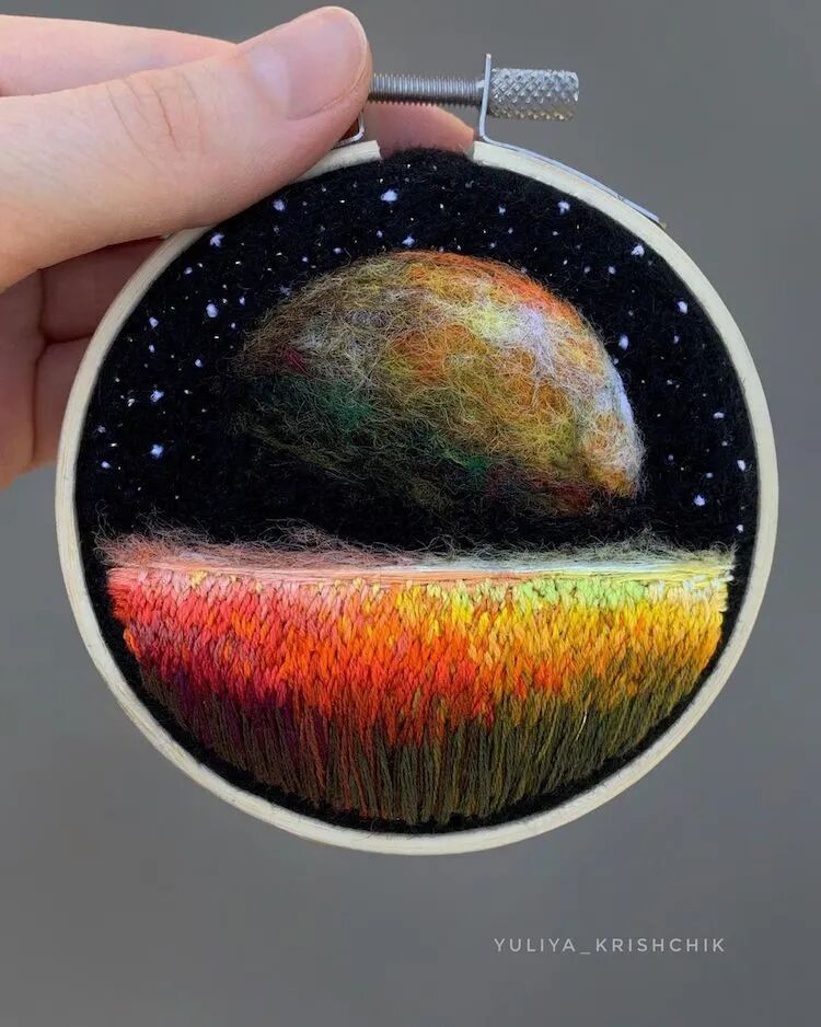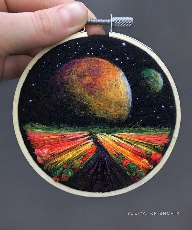 这位美女艺术家从小便对浩瀚的太空感兴趣,正因为如此,她决定创作一组以太空为灵感的刺绣艺术。尤利娅·克里希克将自己的想象,和梦境中曾经出现的场景,用刺绣的方式呈现出来,奇幻的超现实主义,美得不像话。