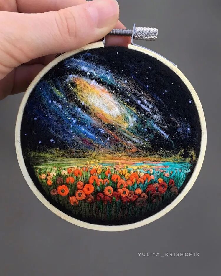 尤利娅·克里希克使用了多种工艺的刺绣技法,选用的材料也不止是简单的针线,例如,行星和螺旋星系通常以毡网为主,而盛开的花朵则是用粗针缝制成的。并且,这位艺术家还在刺绣作品中,模仿了油画和水彩的质感。对色彩的运用和把握,几乎到了极致。