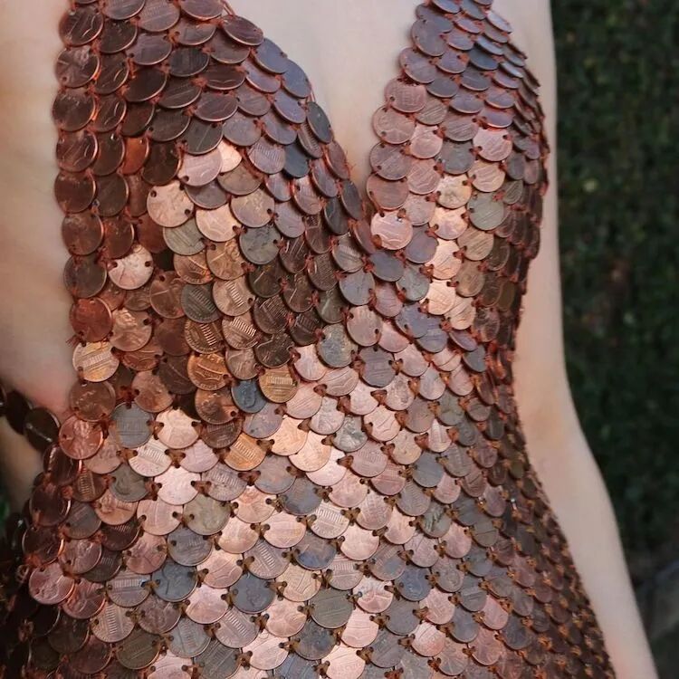 罗斯·谢伊首先将收集到的硬币进行彻底清洗,然后逐个在侧面钻孔,这一步尤其重要,是将它们串在一起的关键。艺术家将这些硬币一点一点缝合在一起,并制作出连衣裙的紧身胸衣和裙子的部分。这一件纯手工打造的礼服裙,可以说相当重工和奢华了,试问,哪个女孩子不想拥有一条真金白银打造的礼服裙呢?