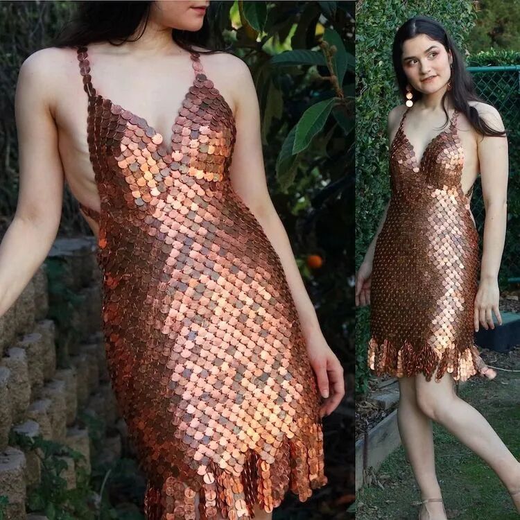 接下来,我们就一起欣赏一下这位才华横溢的艺术家,用硬币打造的亮片礼服裙吧。