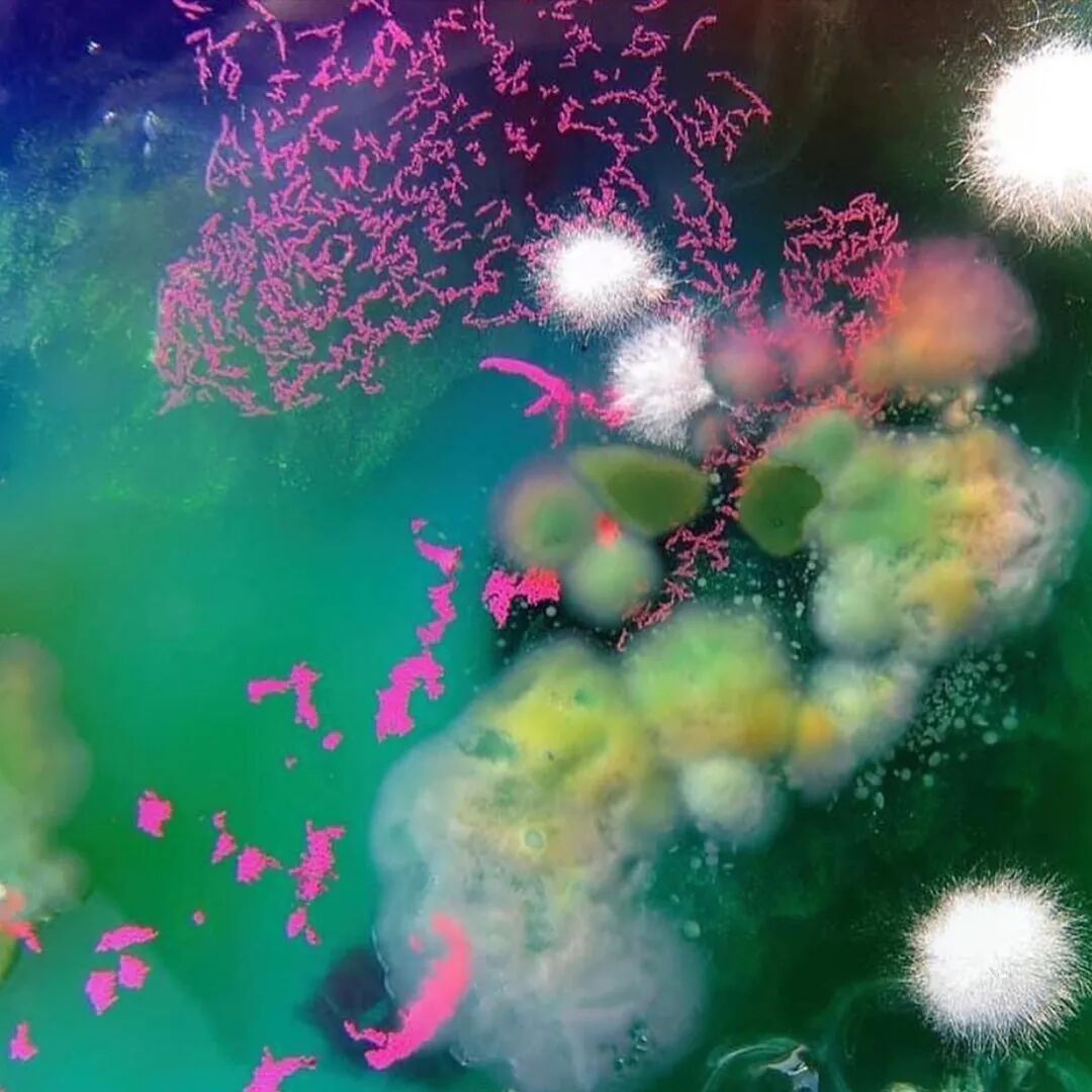 艺术家说,这些作品是科学和艺术的结合,从艺术的角度来看,这些由细菌组成的图案,就像是一幅精彩的抽象画作。从科学的角度来观察,我们每一个人的周围都有大量的孢子和微生物,这些肉眼不可见的事物,往往会随着呼吸进入到我们的身体中或附着到皮肤上,将这些孢子和微生物培养起来,就像是把我们看不到的事物具象化。